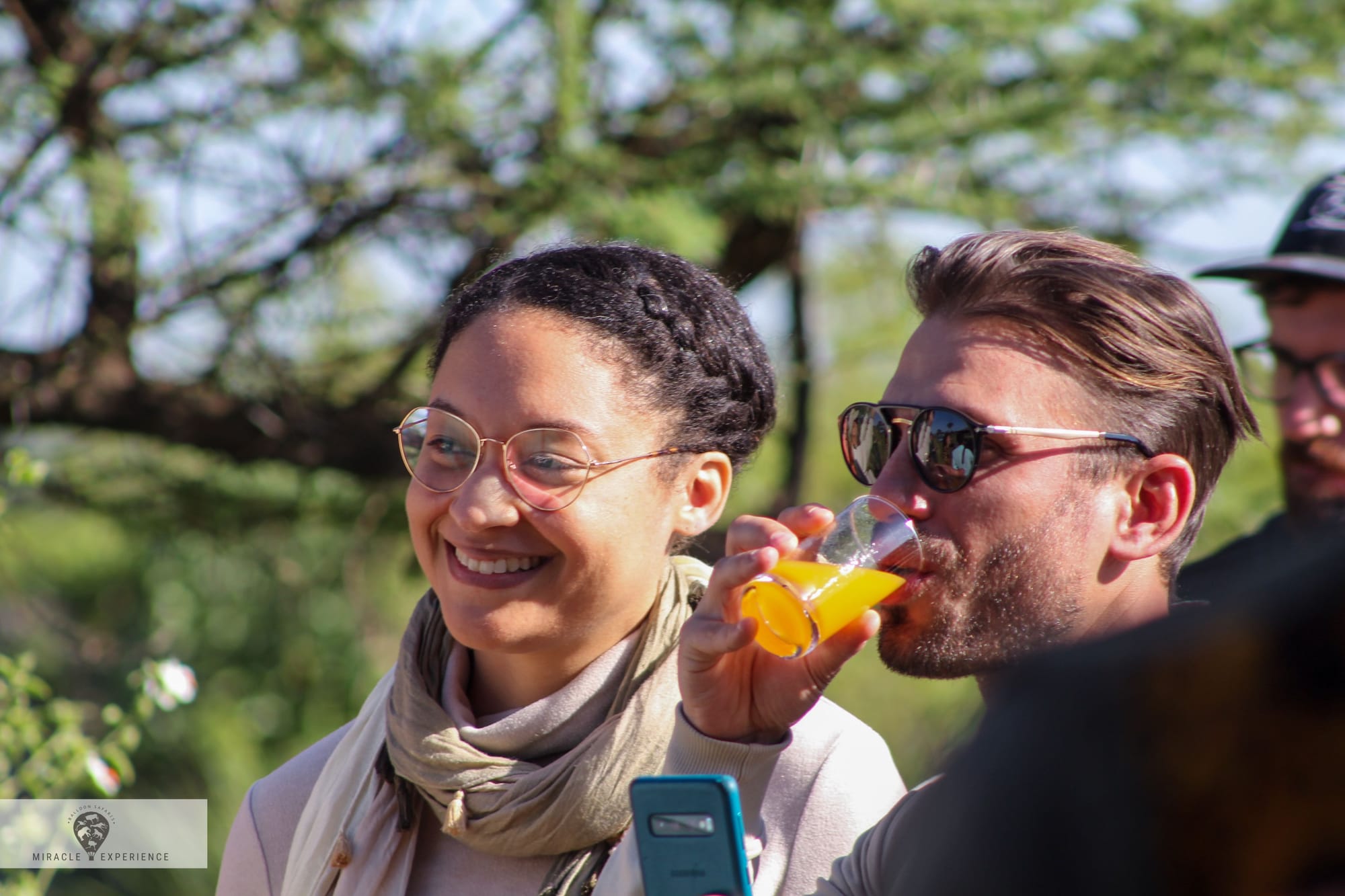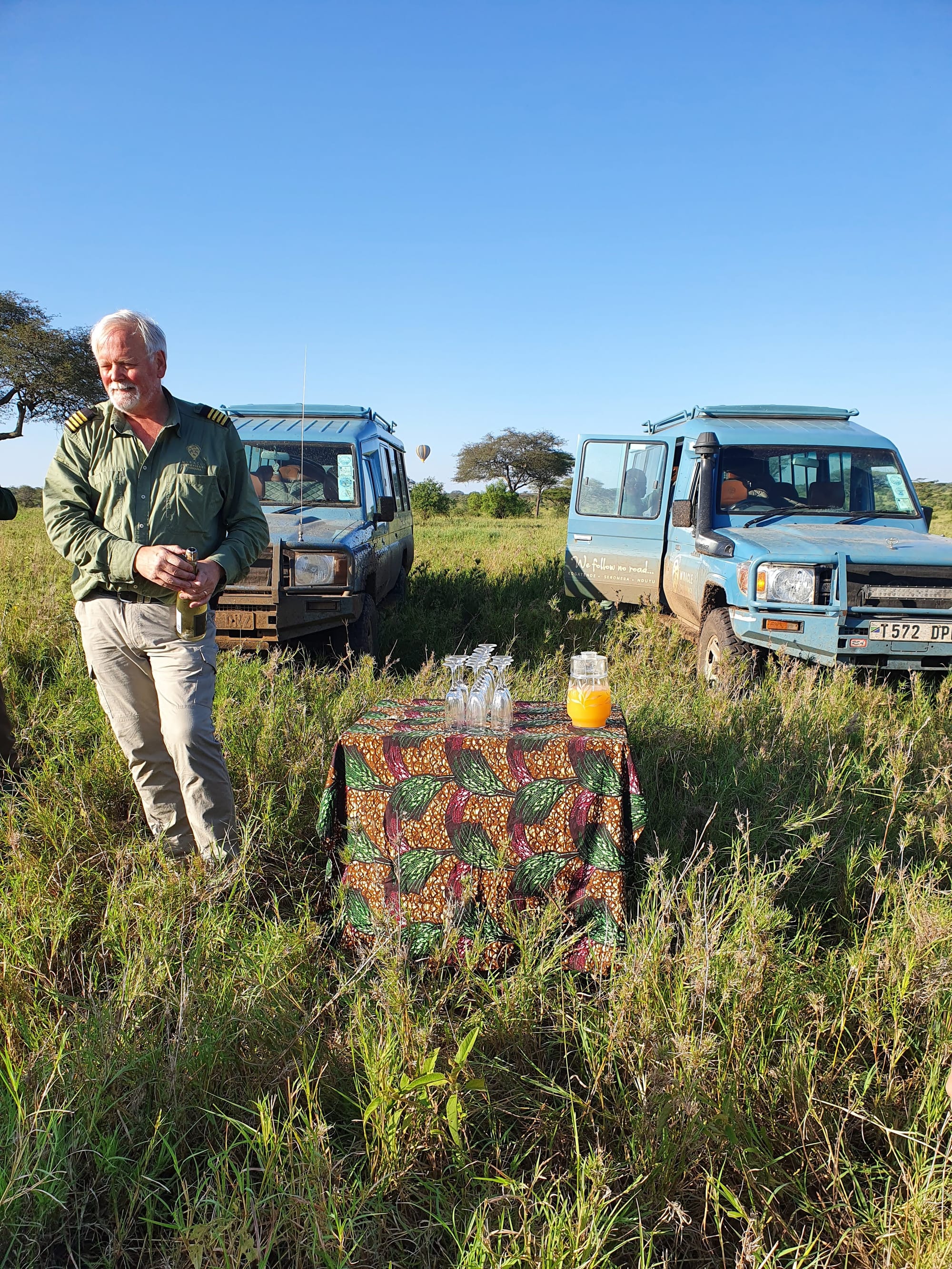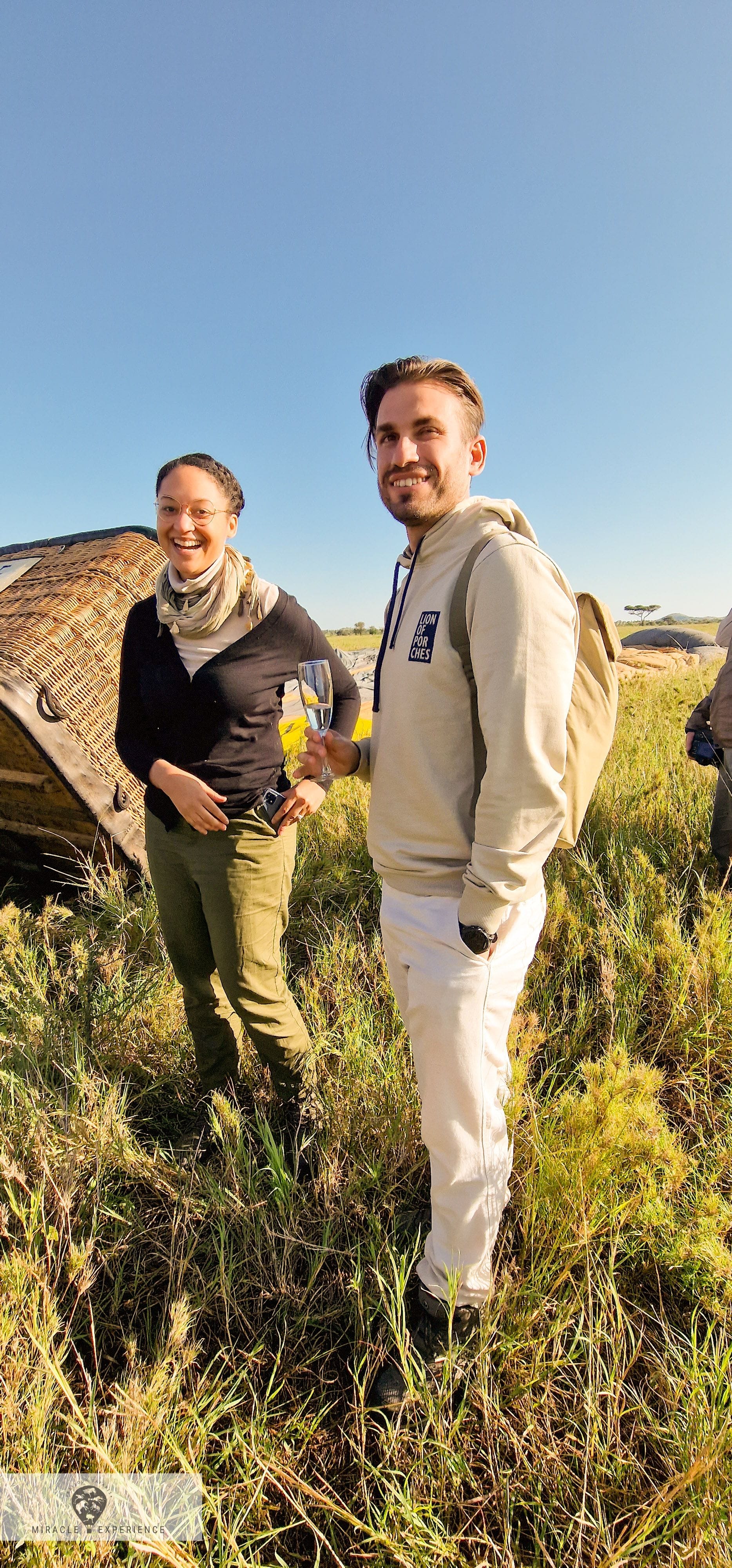 As we touched down — a graceful "Pilot's landing" as Bill said — on the damp Serengeti earth, our pilot Bill, whom we were already in awe of for guiding us so calmly through the skies, did what balloonists have done since the 18th century: he popped open a bottle of champagne. The tradition began in France, where early pilots would offer bubbly to farmers after landing in their fields as a gesture of goodwill (and to prove they weren’t celestial invaders).