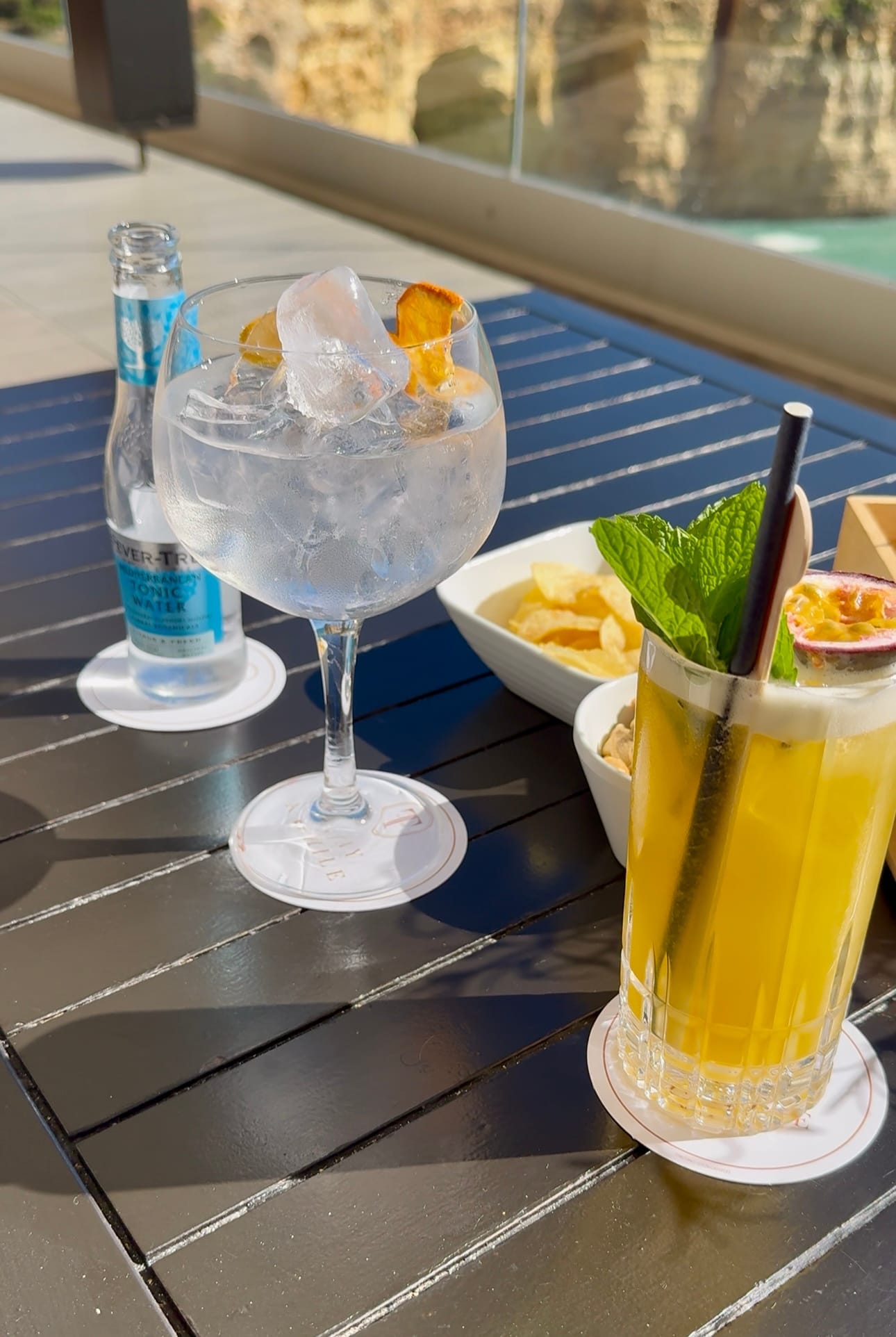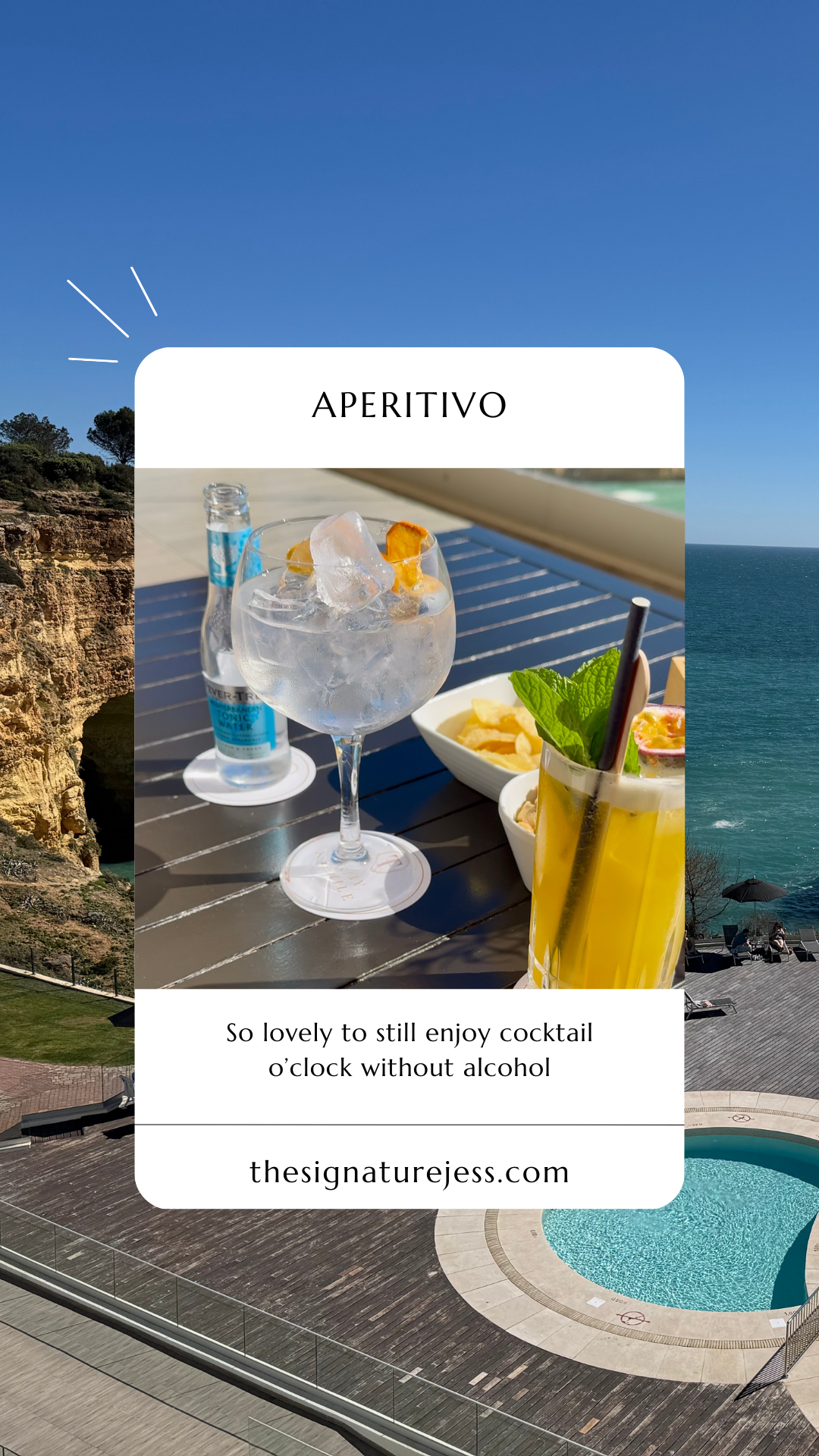 Aperitivo is not a full meal, but more of a celebratory pause with a tipple and a snack. You can make it as fancy as you'd like. So it was quite interesting trying an alcohol-free gin cocktail (with fresh passionfruit!) by the beach at the Tivoli Carvoeiro a few weeks ago at aperitivo time, when we were in the Algarve.