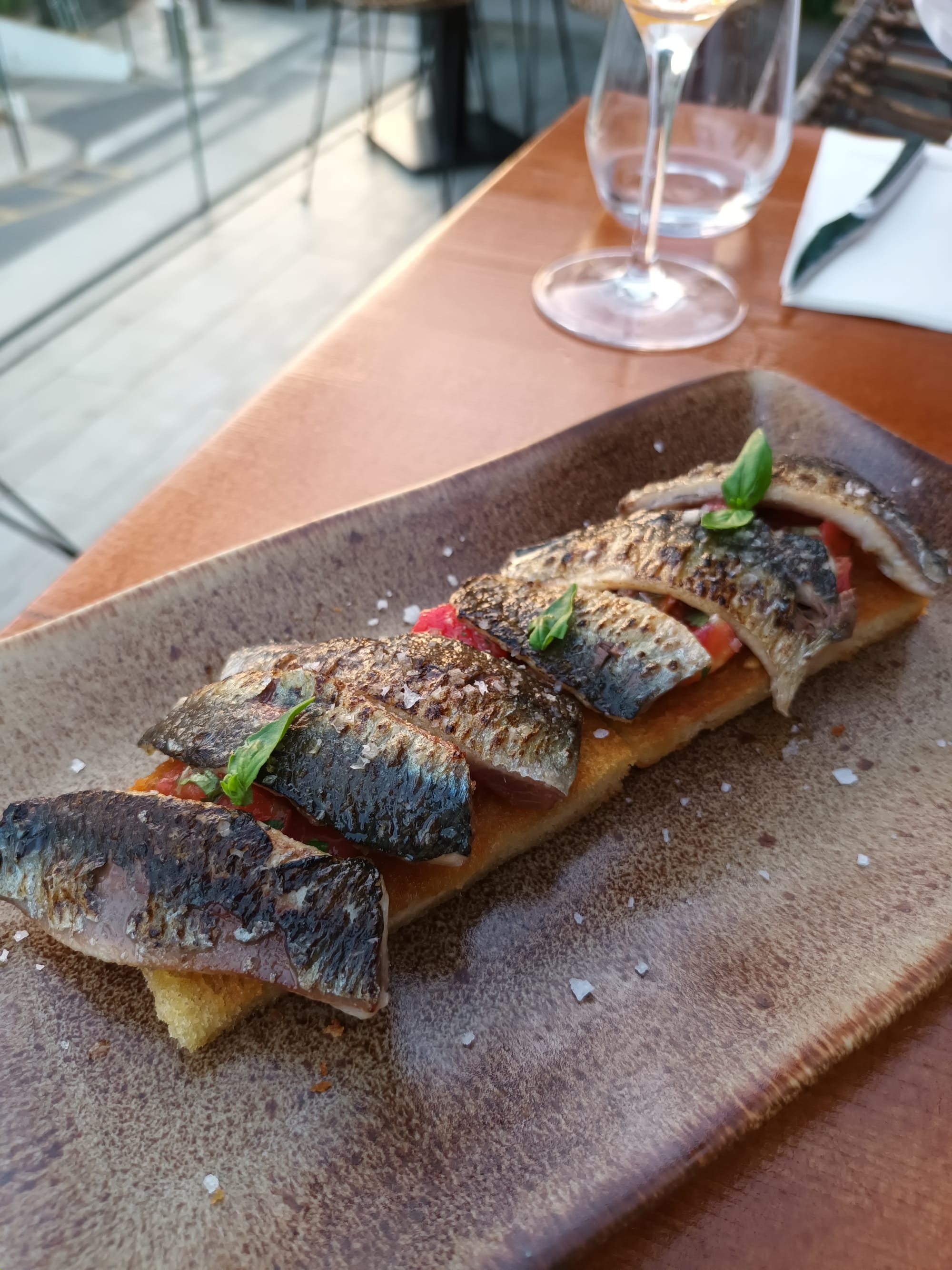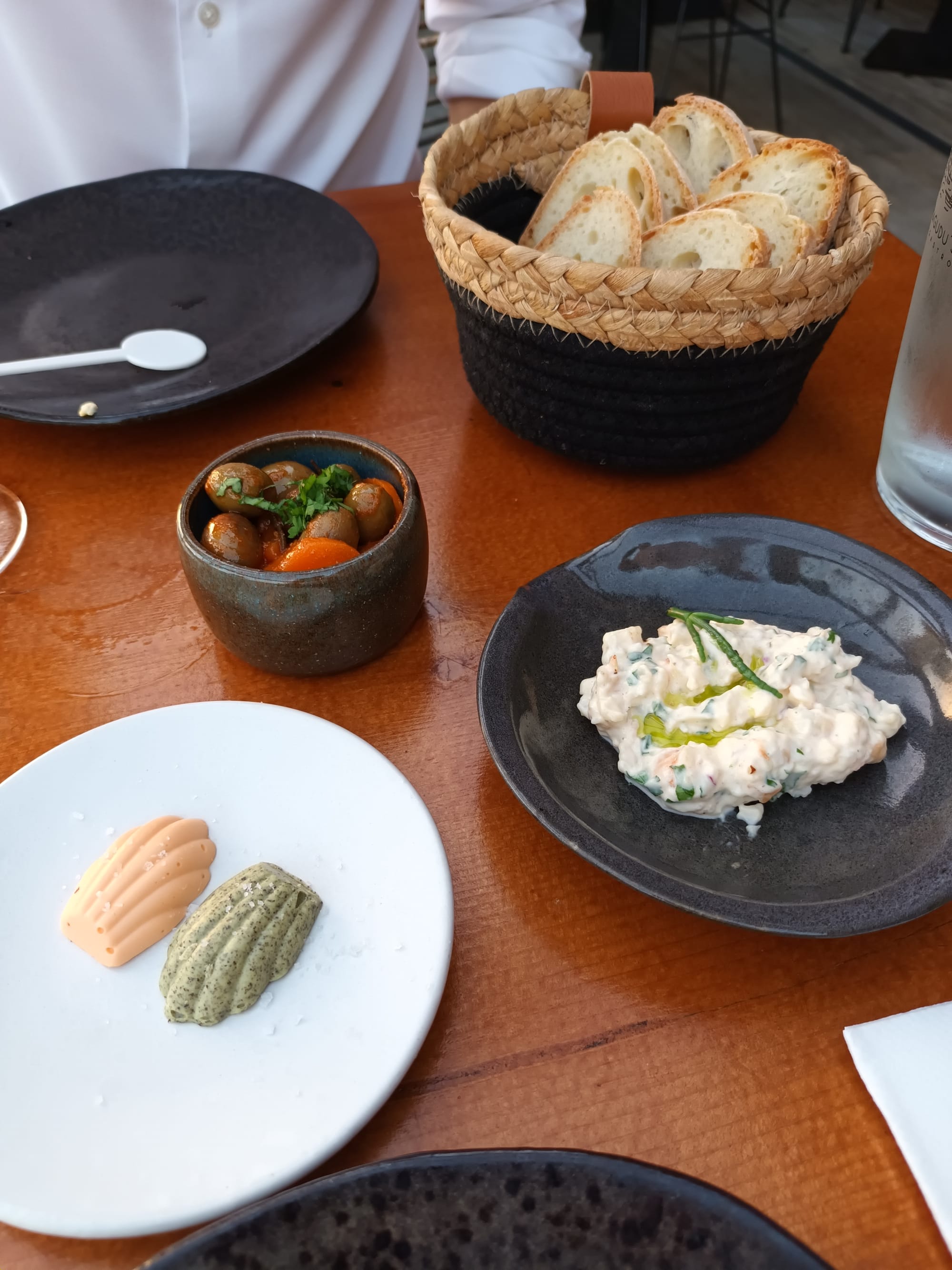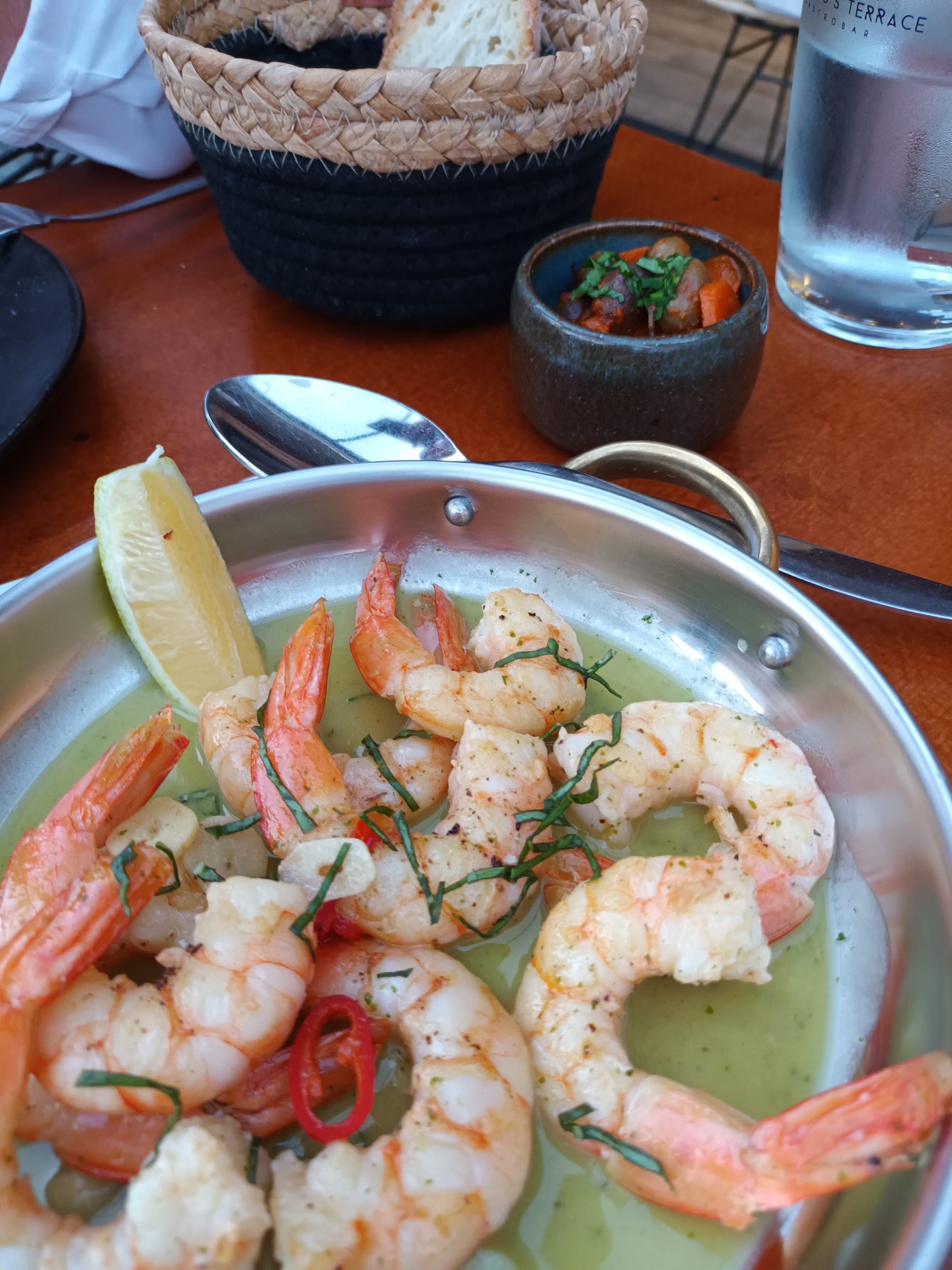 Ferragudu's terrace: Cured carrots butter for couvert | Open Sardine / Mackerel Sandwich | Plancha of sautéed Gambas with garlic and piri piri