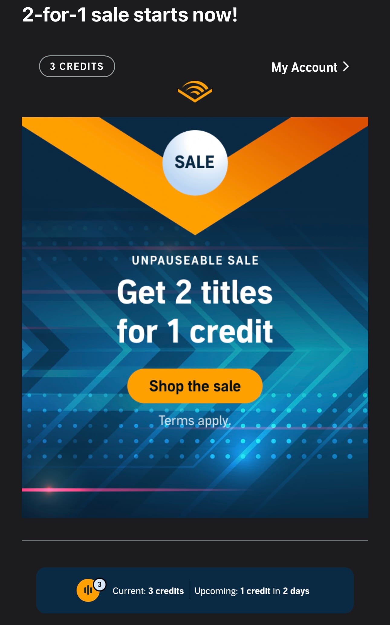 My husband Bruno and I are both audible users and have get a new credit per month each with our subscriptions. I love purchasing new titles when Audible has a sale out and I just got one. For a purchased book - with credit - I will get another one for free.