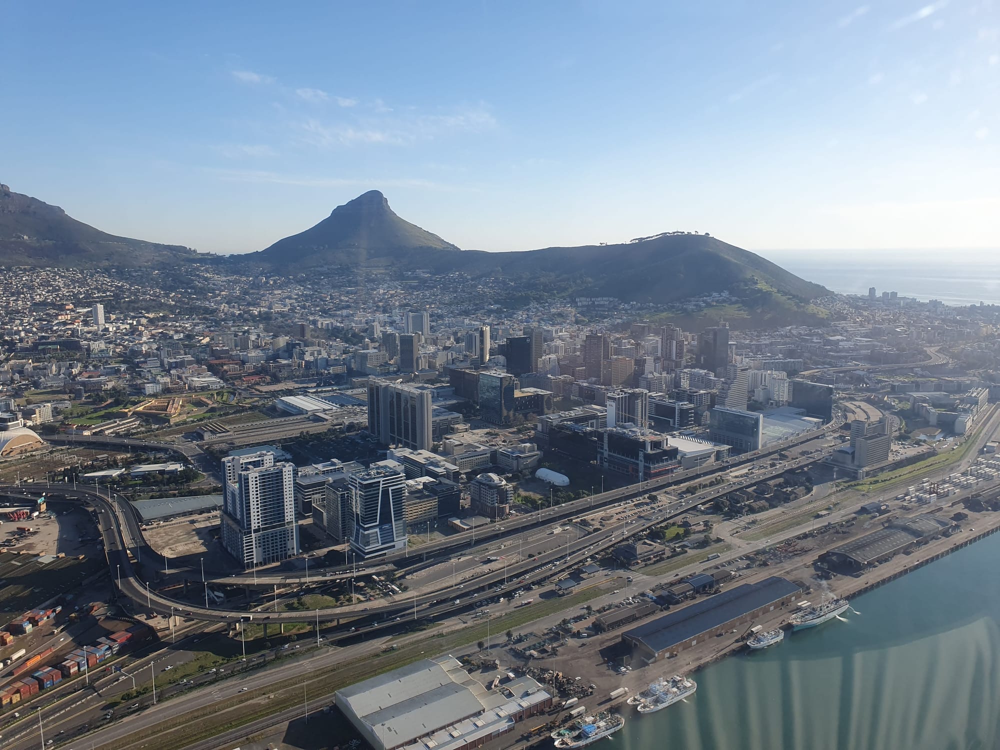 Taking off, first overview of the Waterfront, Lion's Head and Signal Hill, with the majestic Table Mountain in the background