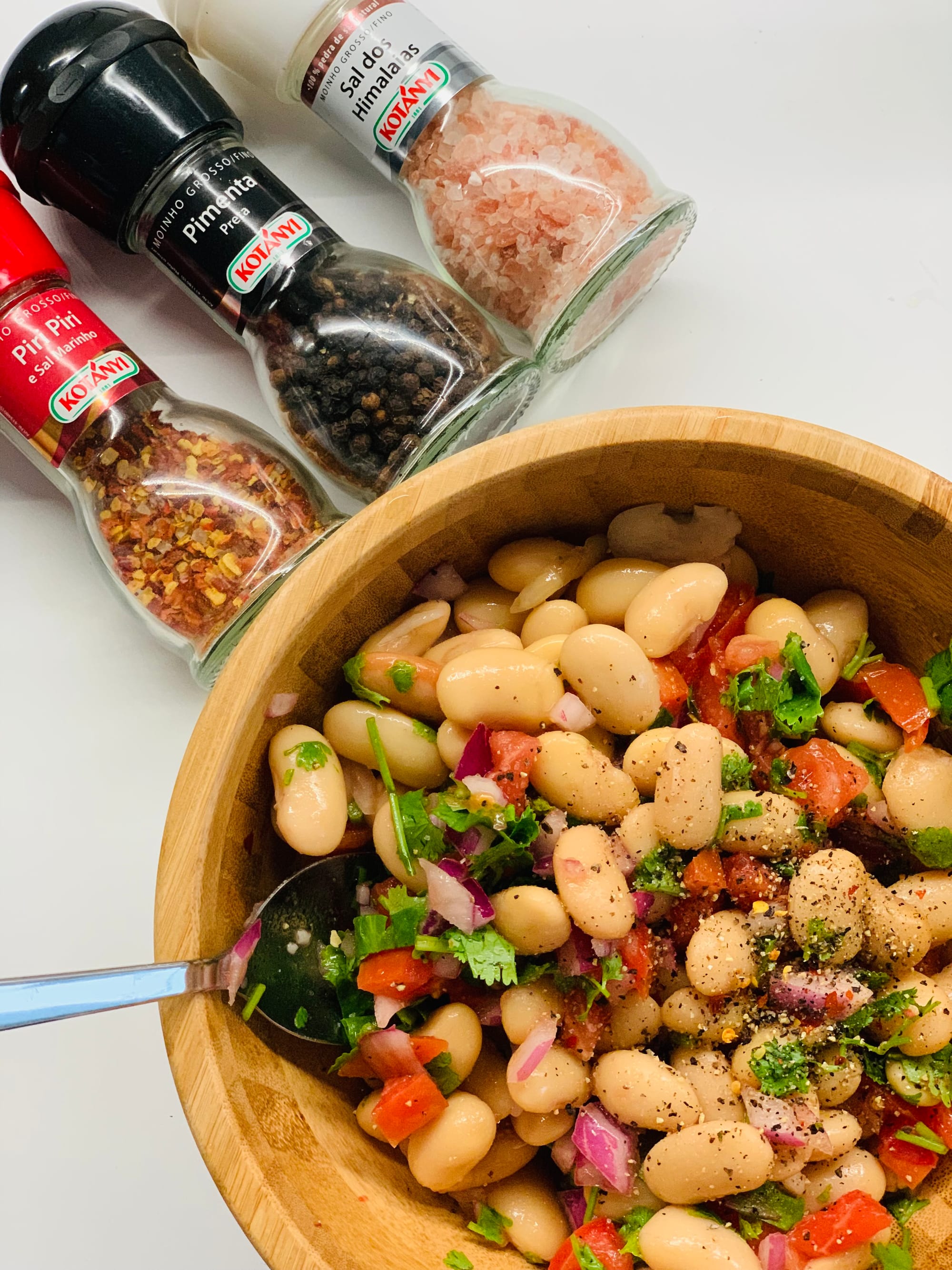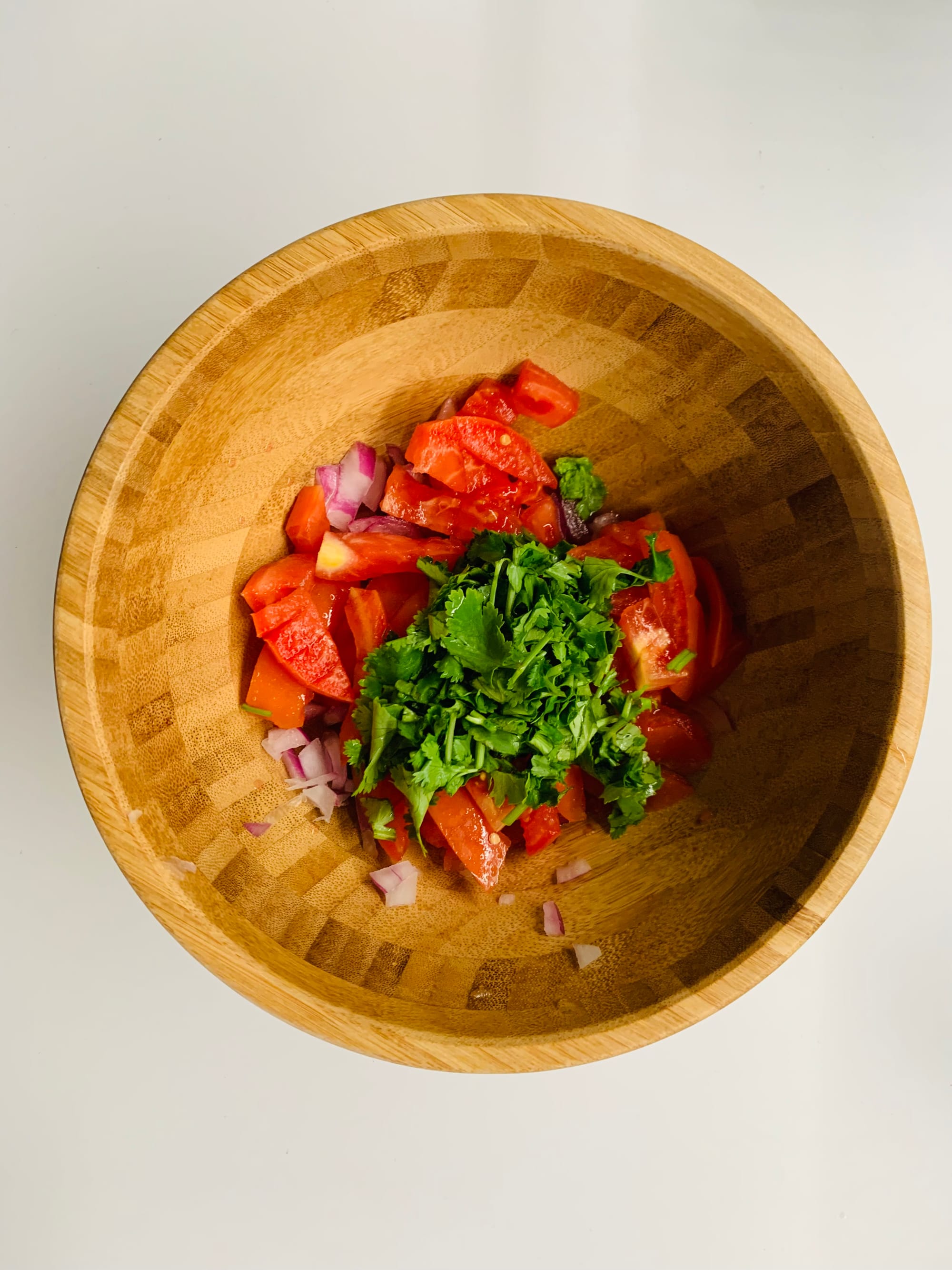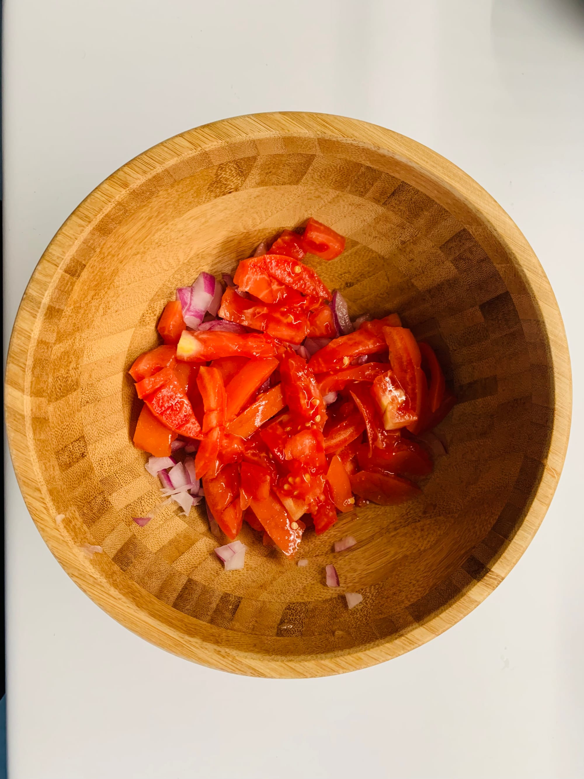 I start with the simple vinaigrette at the bottom of the bowl with olive oil, vinegar and salt. I then add the onion and the tomatoes, mix it and let it marinate a bit so they soak the vinaigrette flavour. To finish up, I add the herb, freshly ground pepper and a bit of chili flakes for a kick, which is totally optional. Mix everything and prepare to enjoy on its own or with a fresh baked fish.