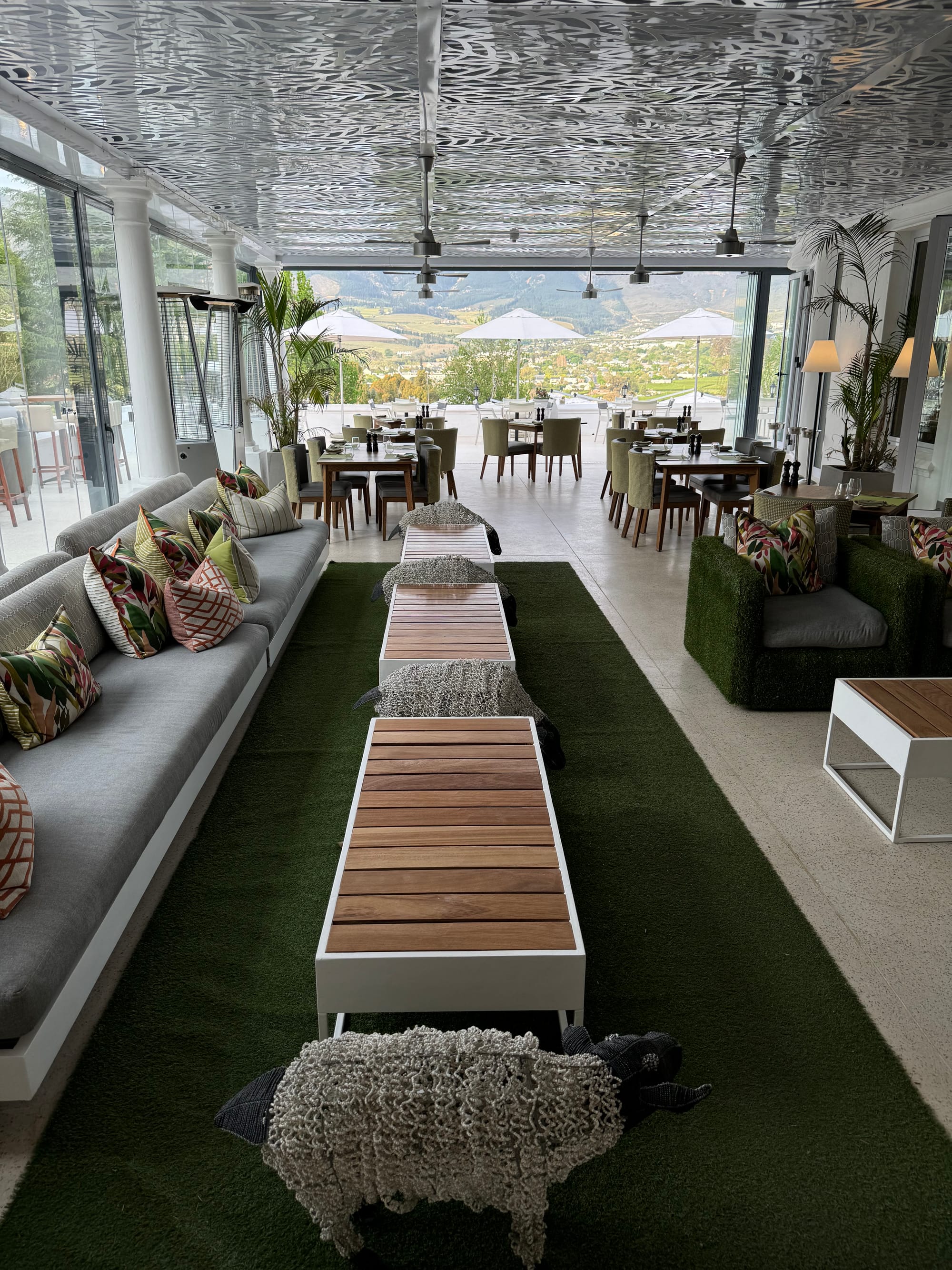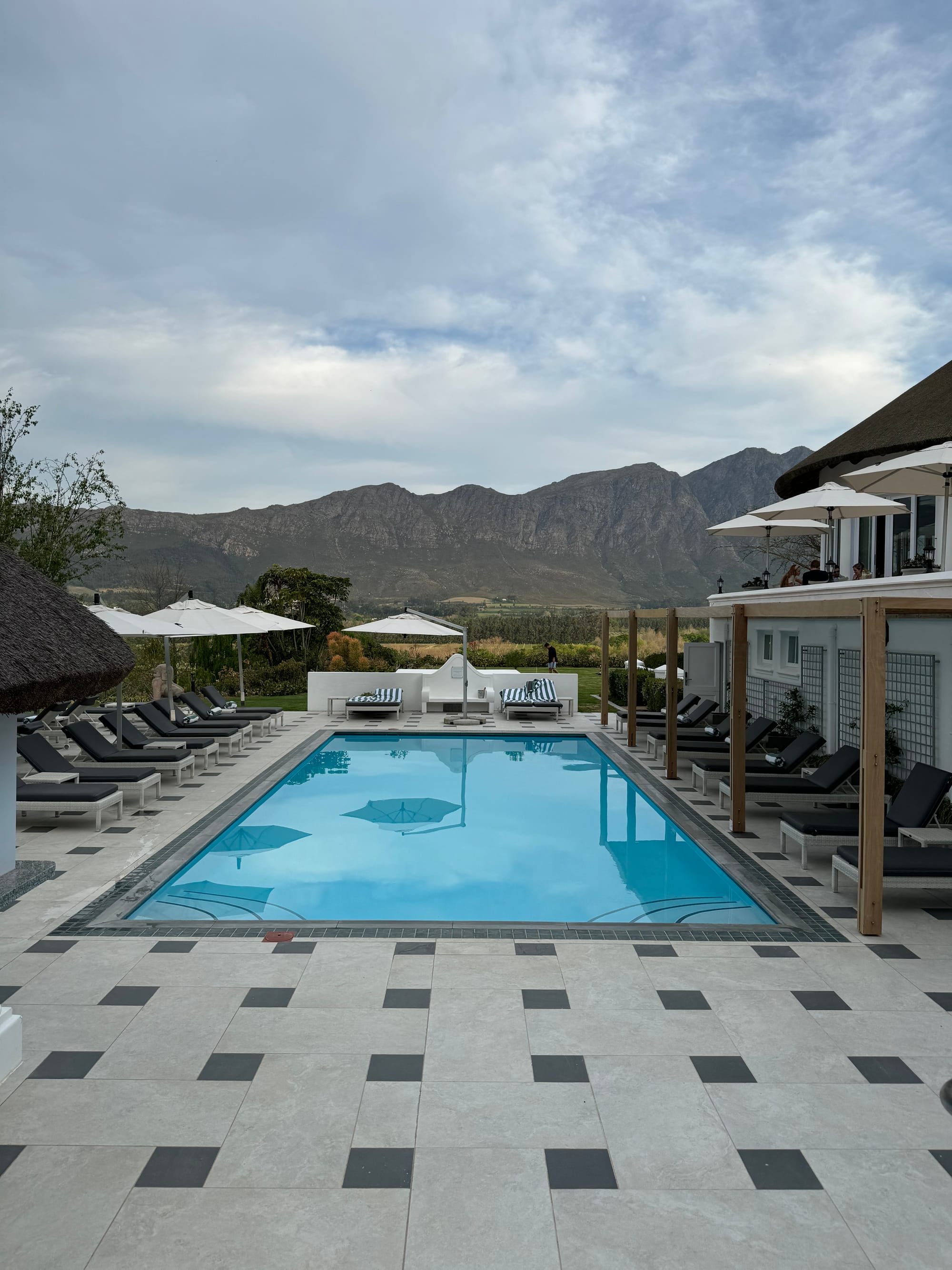 We were warmly greated at Mont Rochelle with wide smiles, dried fruits and, most importantly, some sparkling wine, Cap Method. We then visited the Estate and soaked in into its gorgeous decor and views. Our suite was absolutely spectacular - even bigger than our Luanda flat! - with a wide living and dining room and we had our own heated swimming pool we dived in every day.