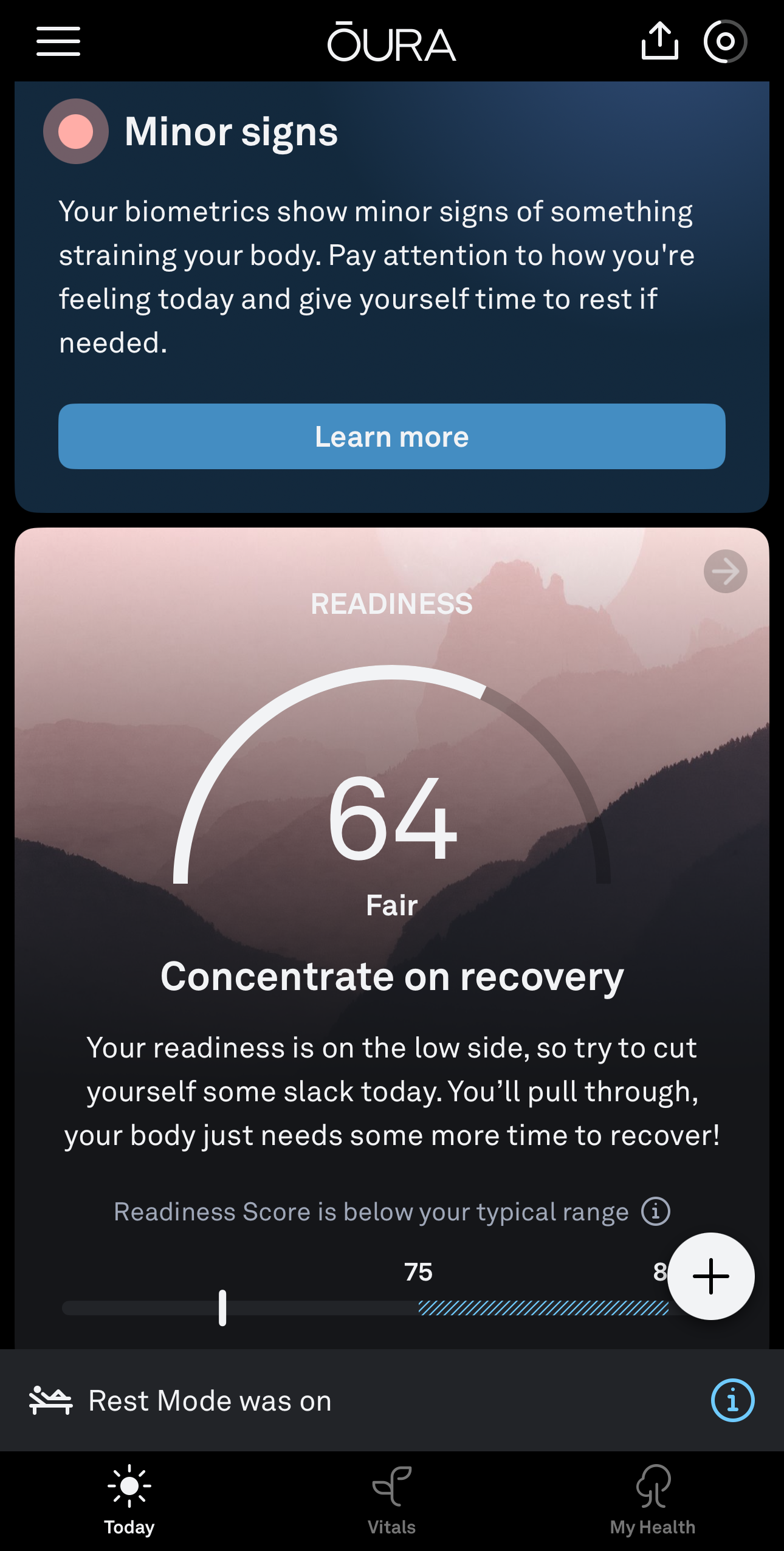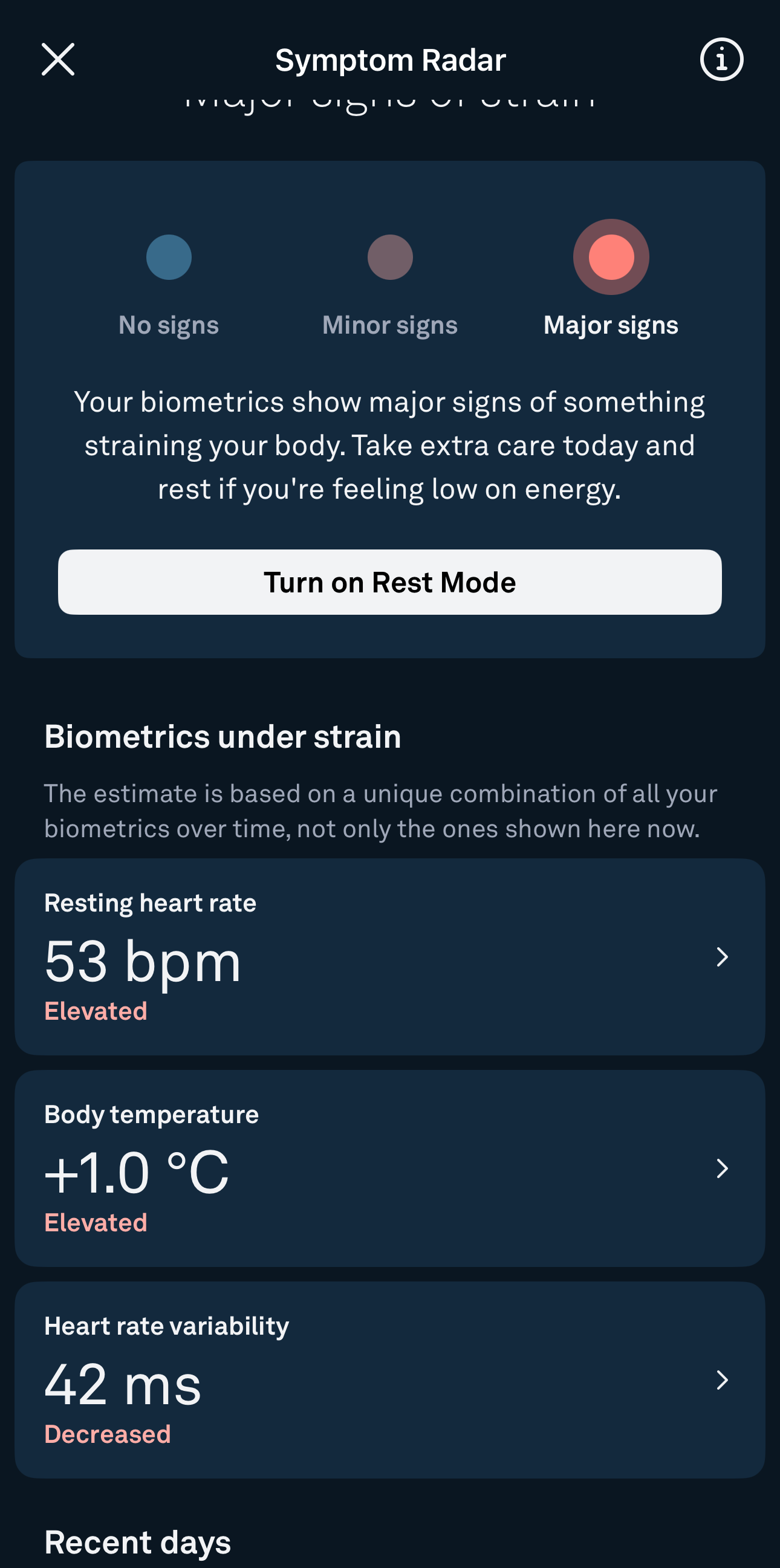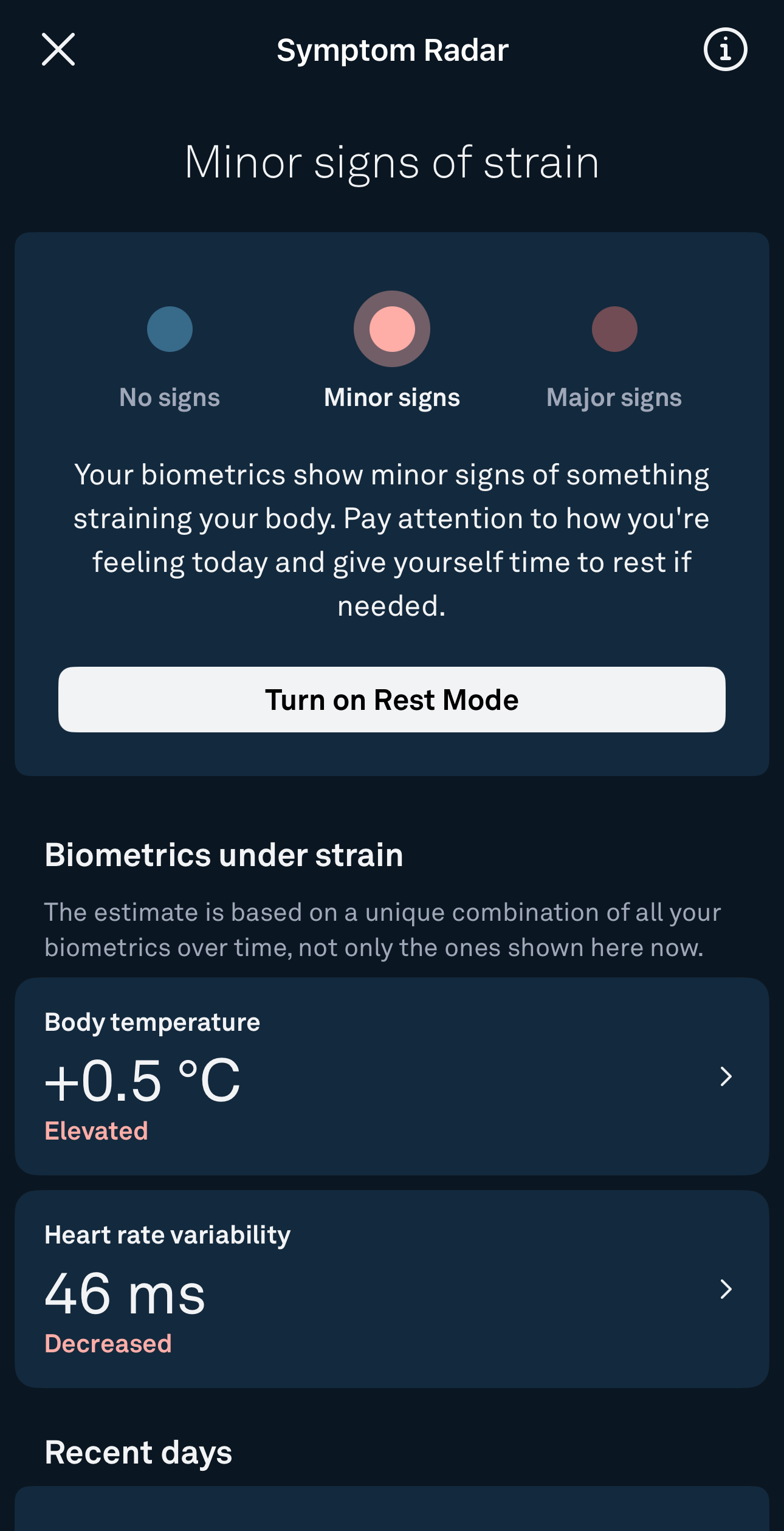 This was also the moment to put the Oura ring to test with its Symptom Radar feature. My readiness score was on the rise (as I was sleeping most of the day due to illness and medication) yet it still noticed something was wrong. It did not fail: it started to pinpoint I was heaving minor symptoms or something coming up, suggesting some much needed rest and to pay attention.
