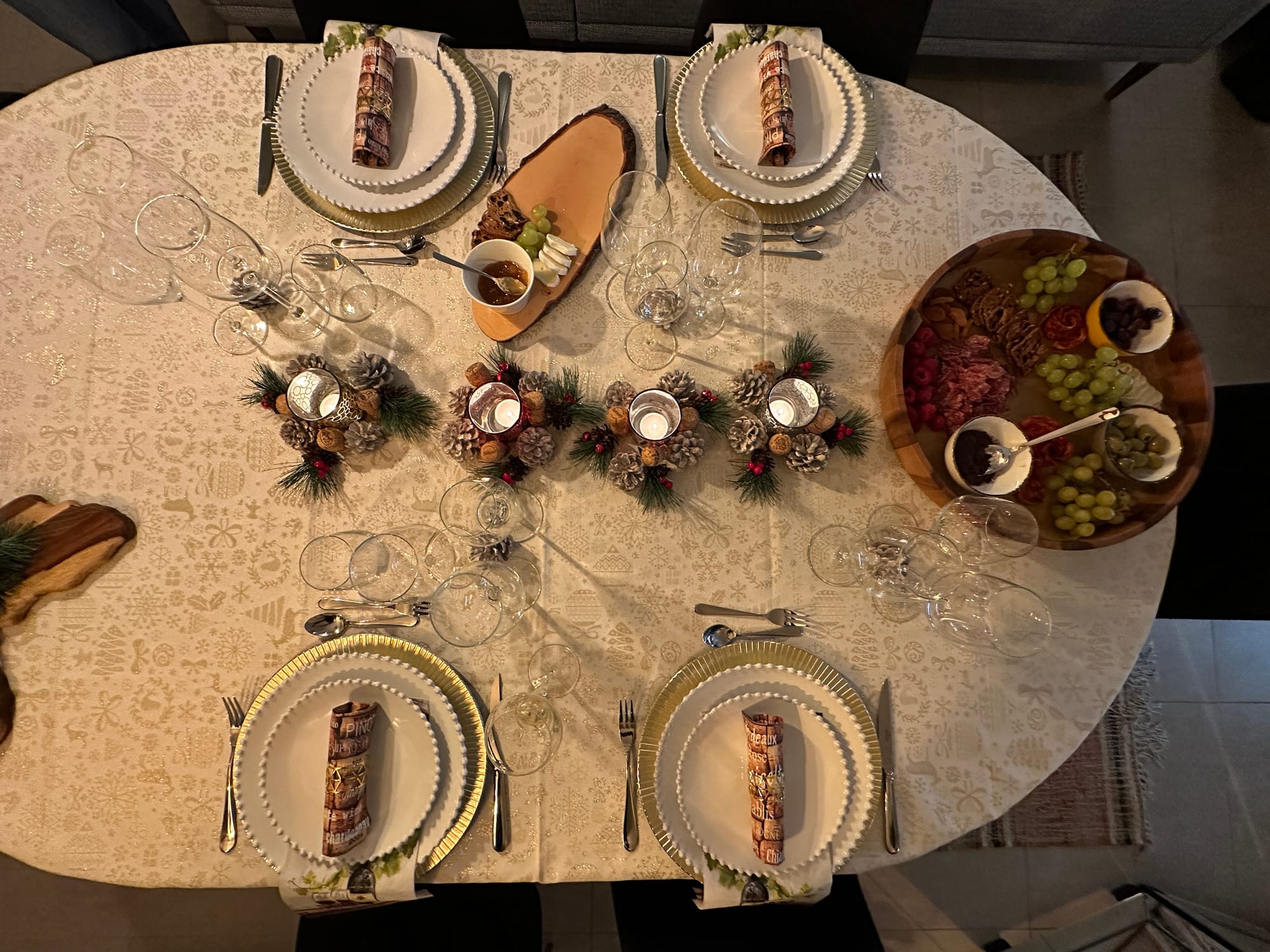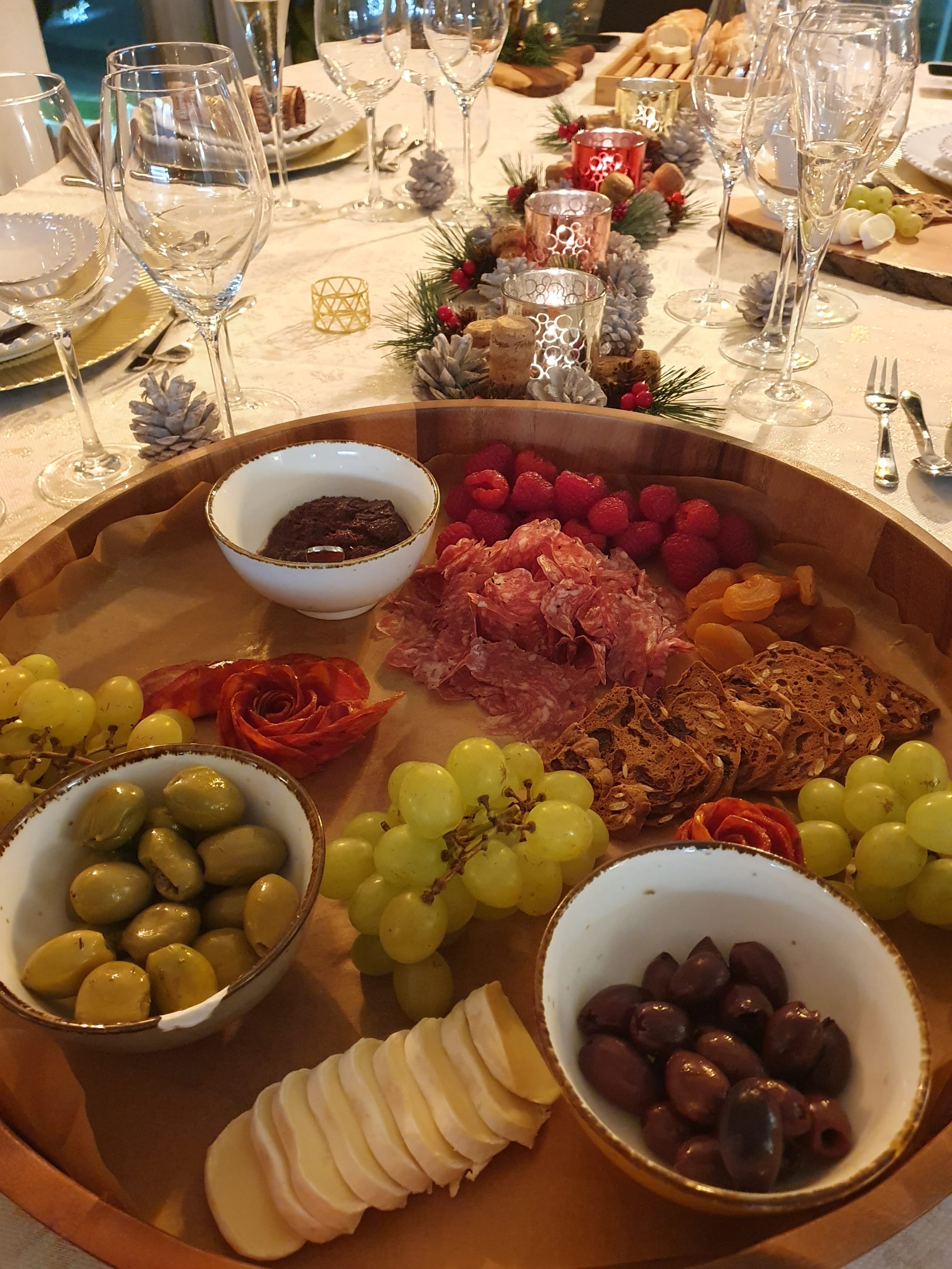 Ambiance is everything, especially for a night like this. We wanted our home to feel like a chic snug chalet nestled in the French Alps. The Christmas decor was up which already set the whole vibe and we had lit unscented candles everywhere. We chose warm-toned pillar candles and scattered fairy lights to create a soft, flickering glow.