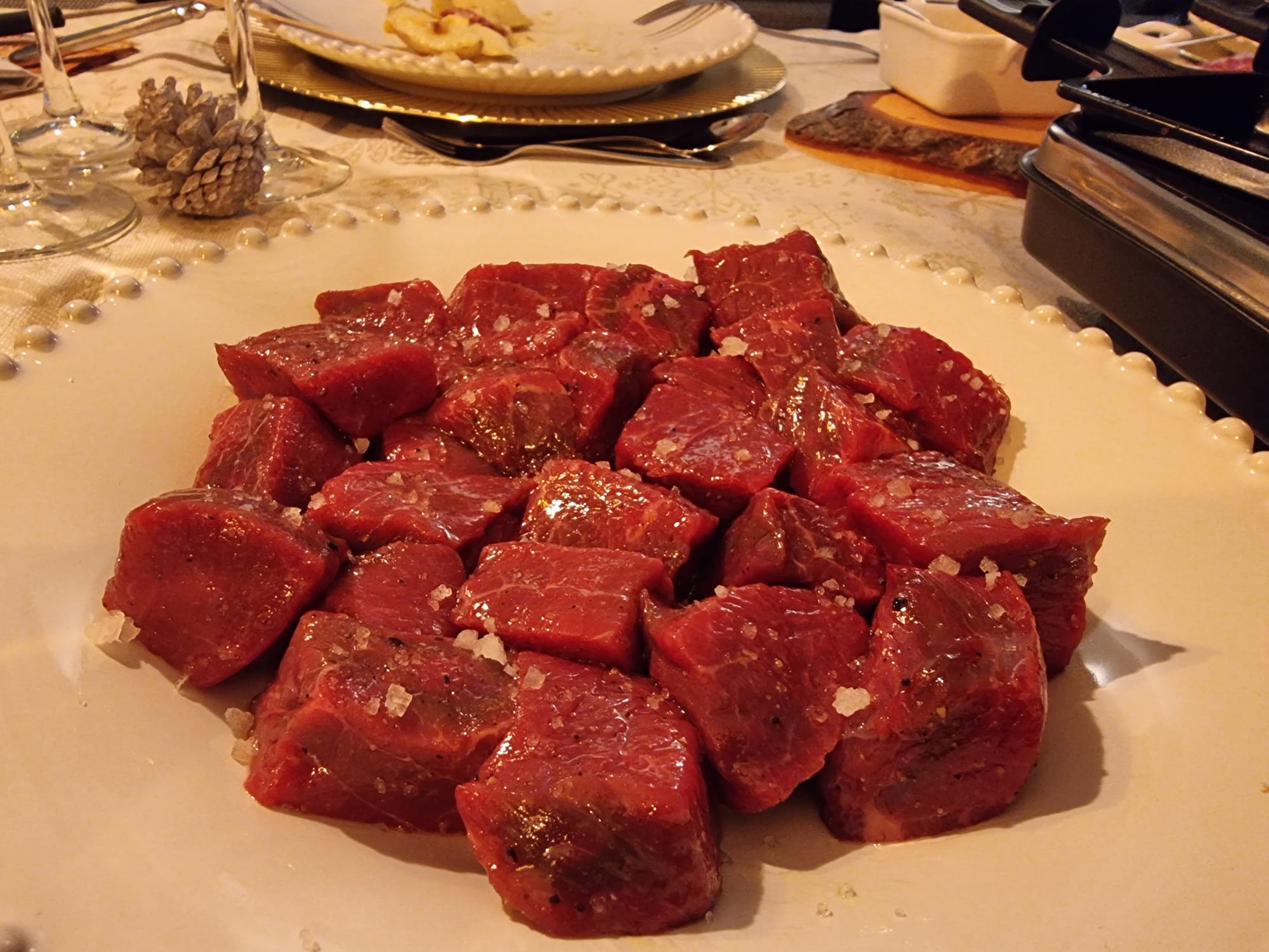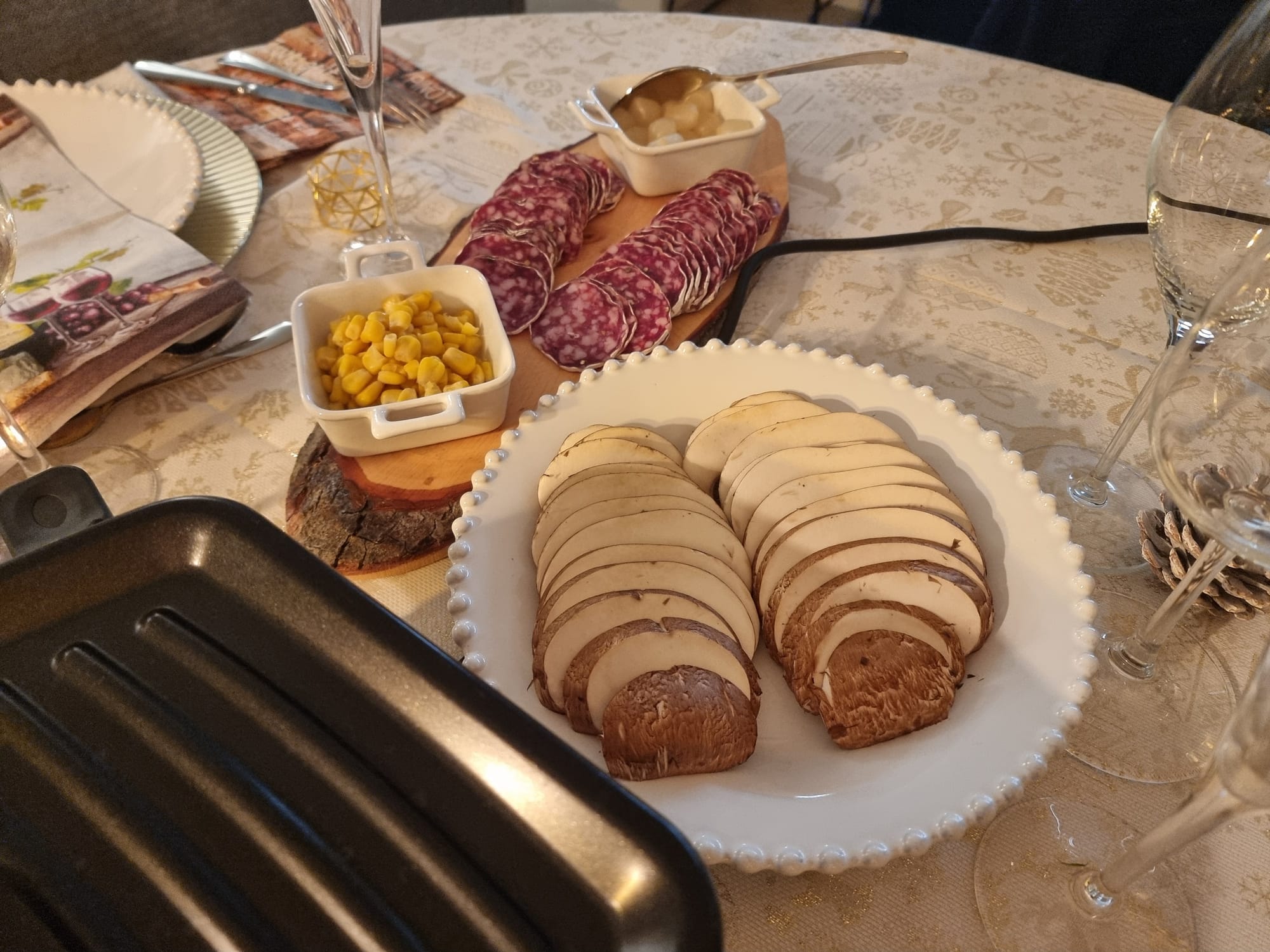 As we were doing the raclette (with cheese), we opted for a meat fondue that could join in in the playfulness for the evening. We opted for the raclette cheese (in Portugal, it's easy to find at Auchan or Aldi and if you are in Algarve, head to Apolonia!). The charcuterie was all french-inspired cured meats and saucisson. For the earthiness, we boiled baby potatoes for the table.