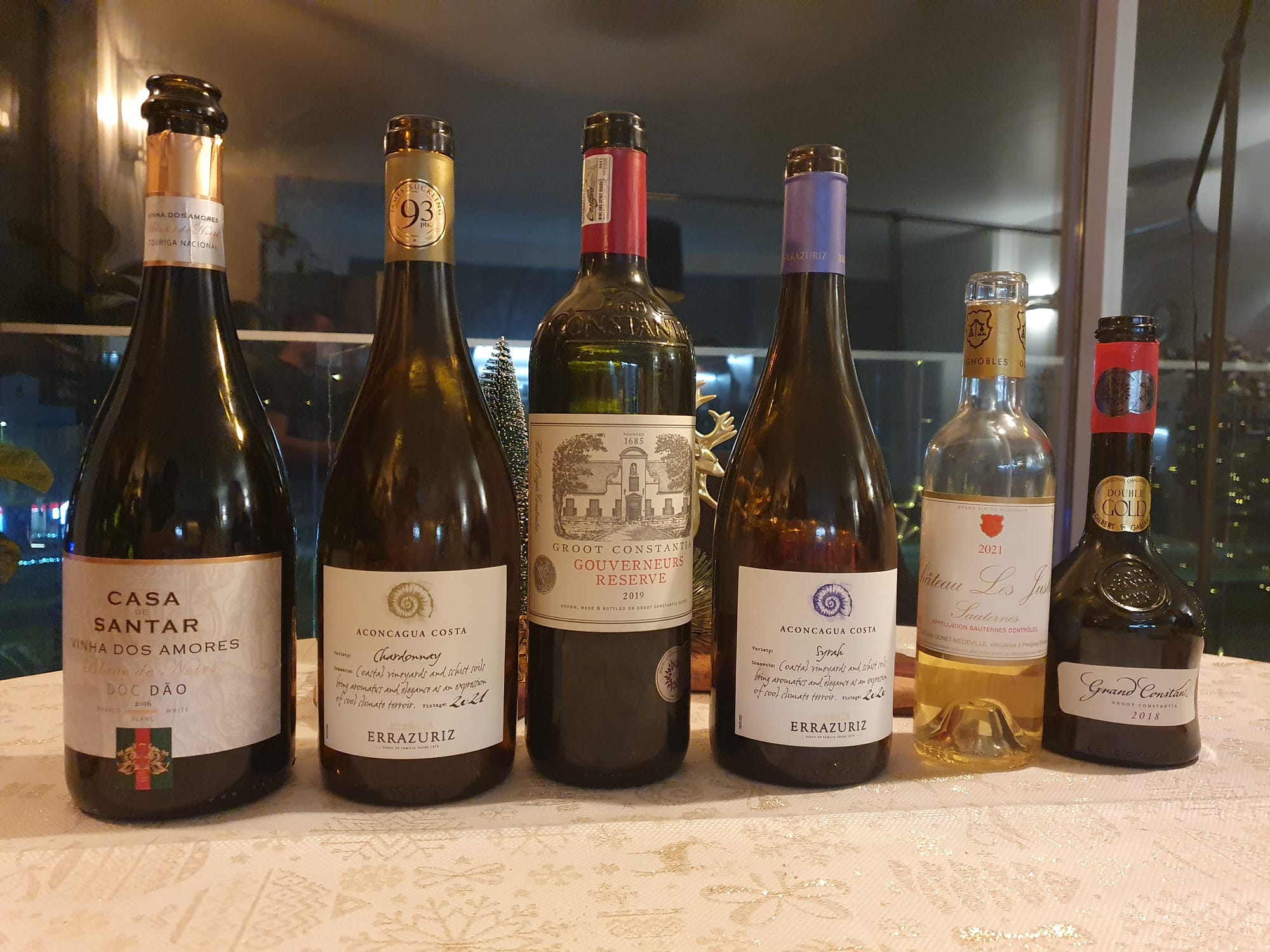 We started with the Casa de Santar Vinha dos Amores Blanc de Noirs sparkling wine (Portugal), then ventured into a crisp Chardonnay with Erraruriz Aconcagua Costa's (Chile). As for the red, we opened a Groot Constantia Gouverneurs Reserve (South Africa) we bought when we were last in Cape Town and a Syrah also by Erraruriz. As for the dessert wines, we honoured France with a Sauternes by Châteay Les Justices and topped it all with a Grand Constantia, Napoleon's exile nectar, also from Groot Constantia. We have to write about Groot Constantia, don't we?!