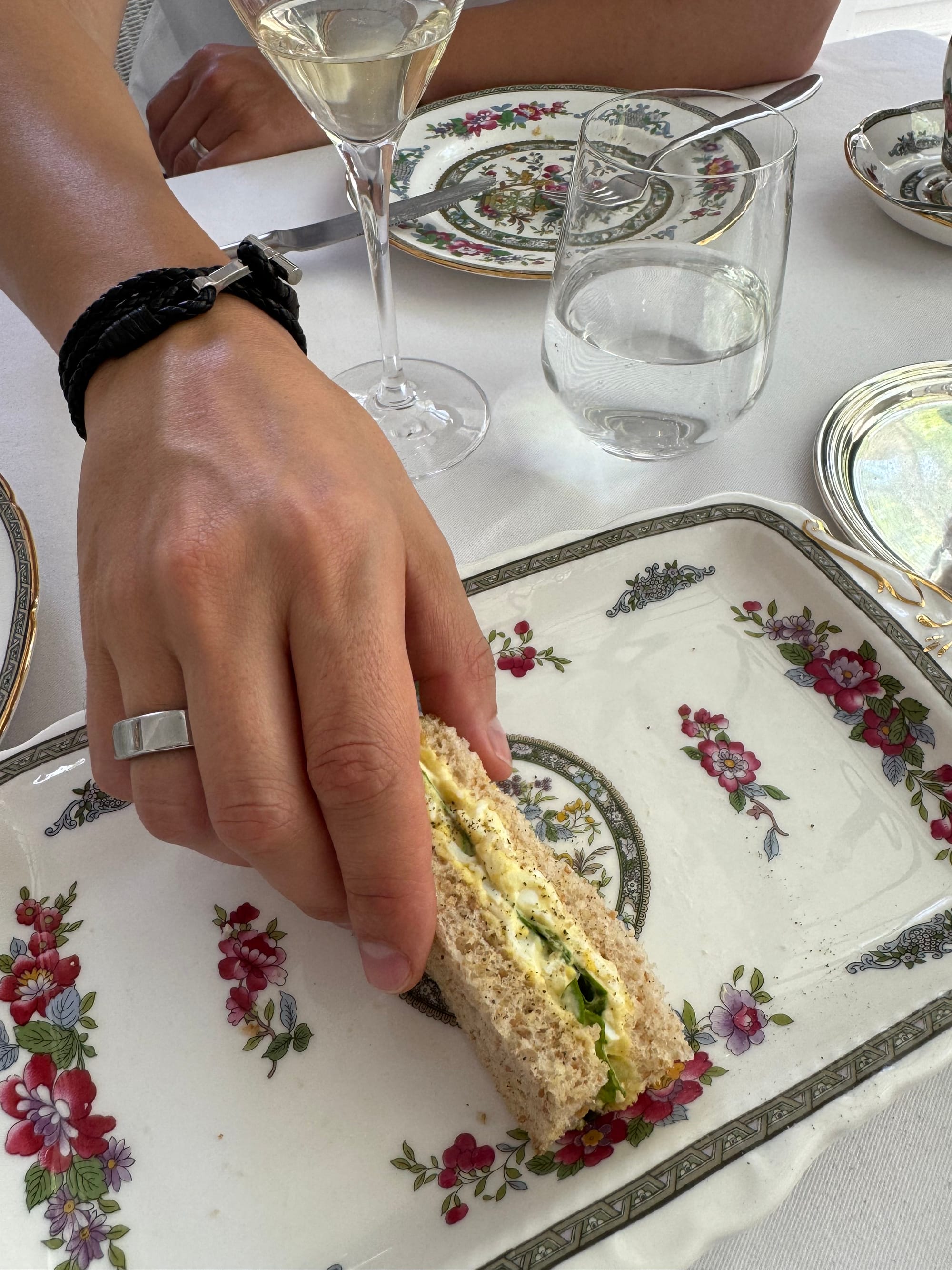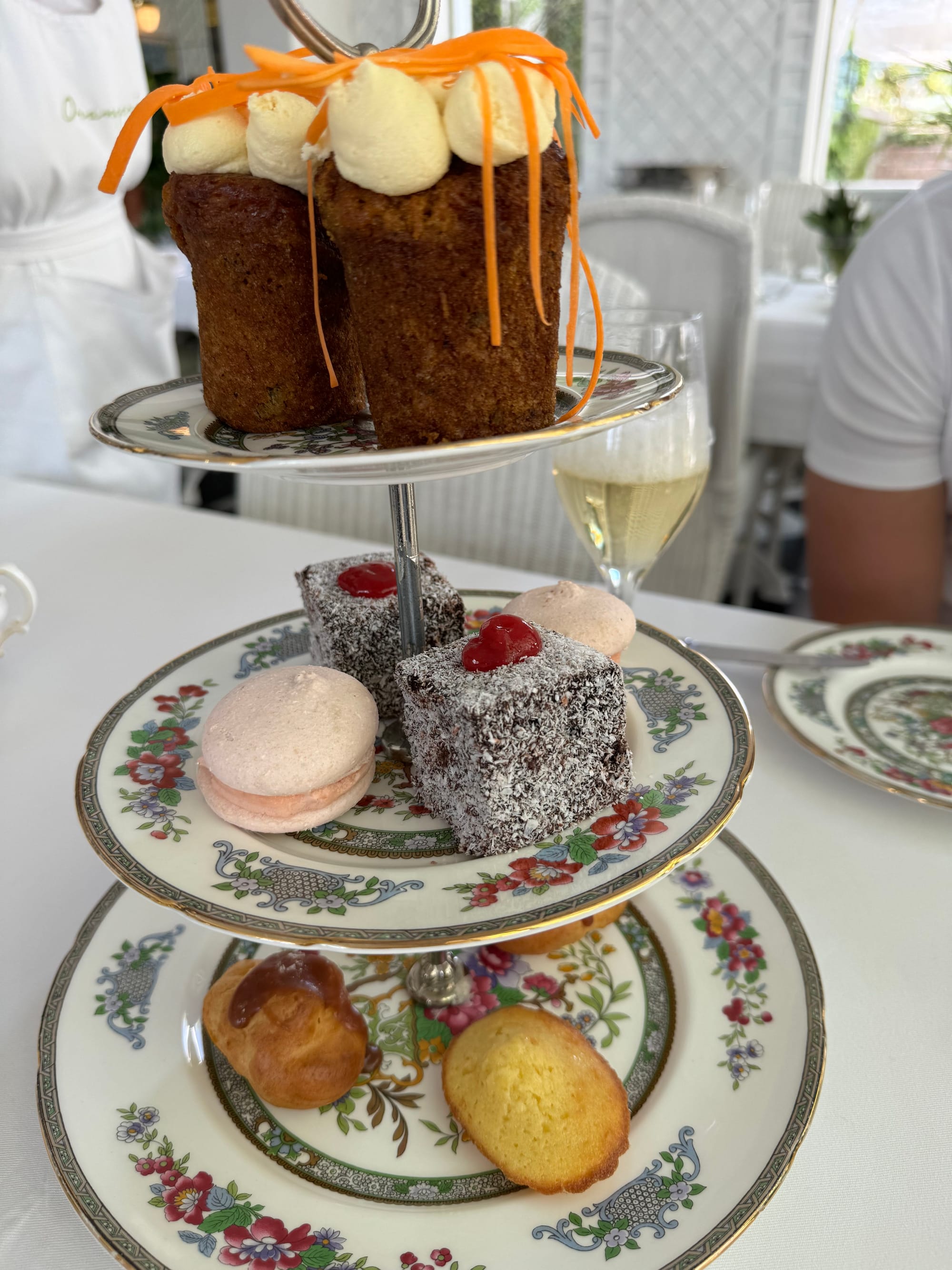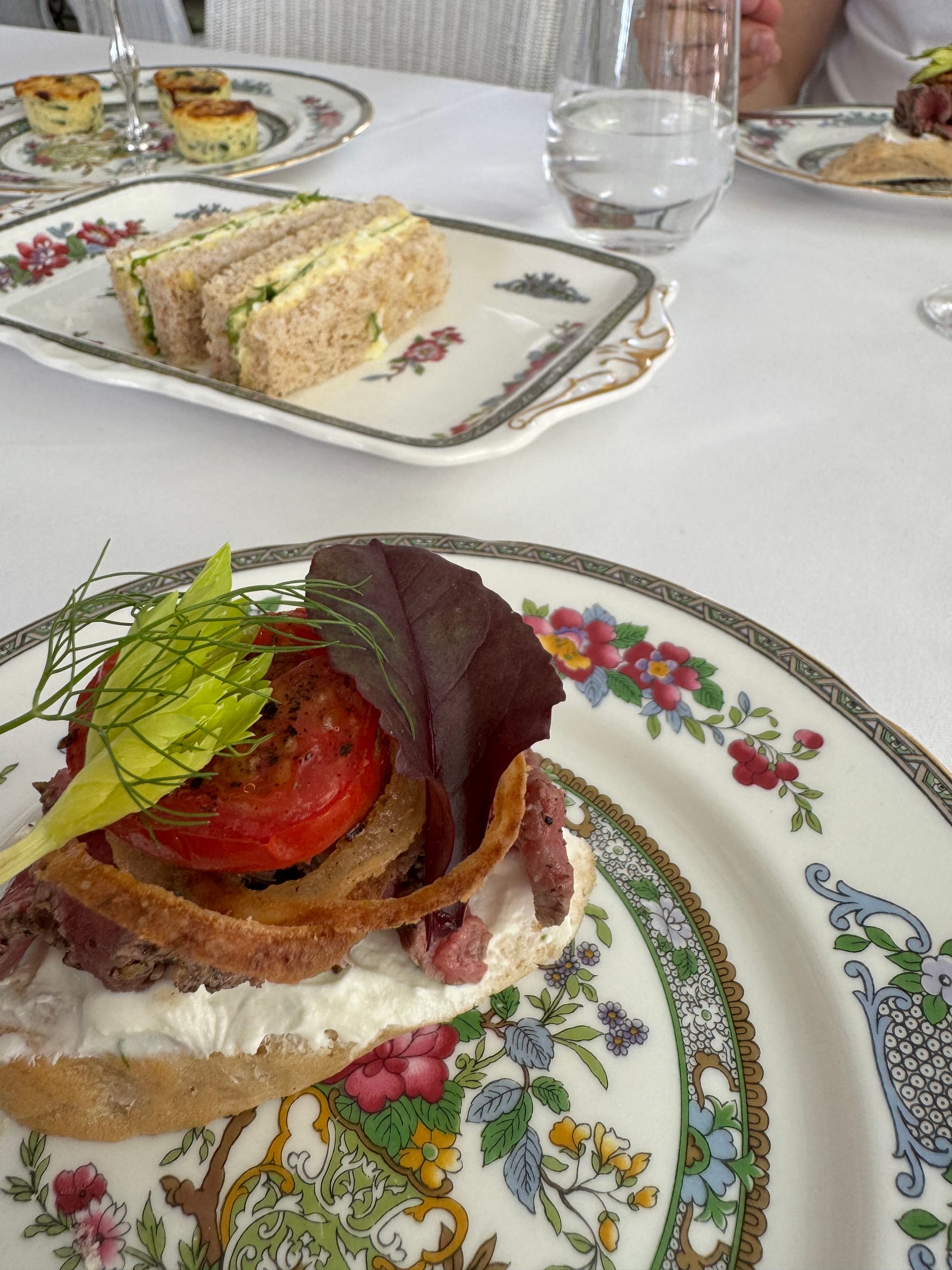 The menu was composed of copious amounts of rooibos tea (my favourite as I don't drink any other type of tea), flûtes of sparkling wine and a festival of savoury and fresh baked goods. We loved the egg salad, salmon and cucumber sandwiches and the most delightful roast beef open sandwich (which reminded us our smorebrod in Denmark) with crisp onion and feta spread (A-MA-ZING), as well as the baby spinach frittatas.