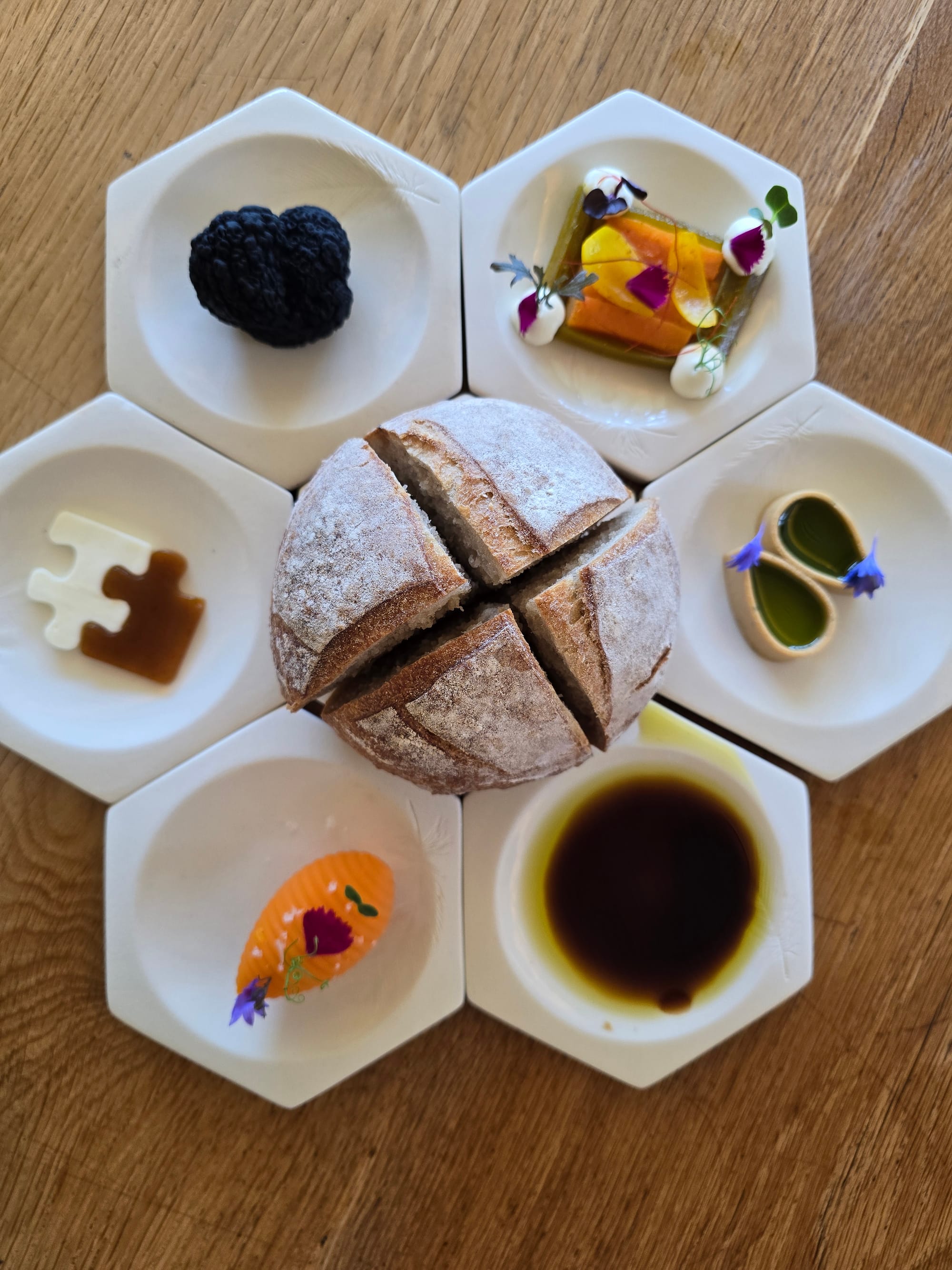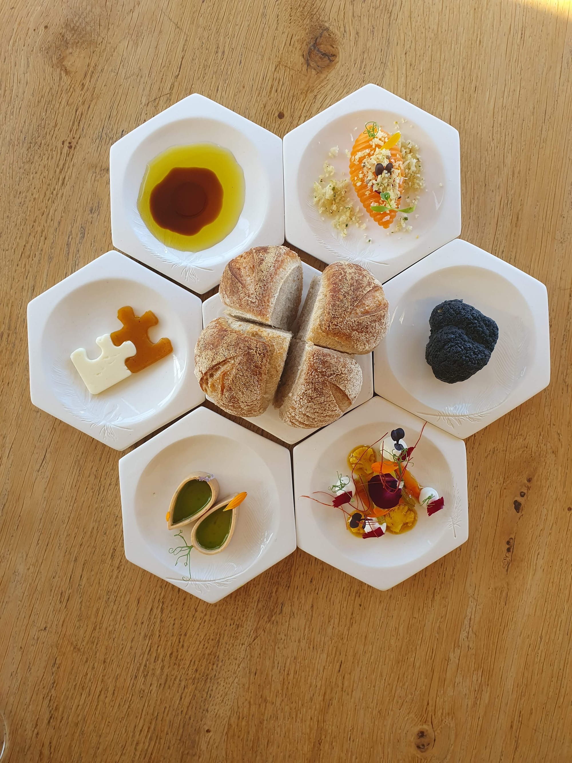 We started with fresh bread with the hexagon couvert, with marmelade, cheese, olive oil, balsamic, foie gras and the most gorgeous flavours. And when in Cape Town, you have to go for the Cap Classique sparkling wine. We always bring a few (many) bottles back home from this gorgeous bubbly nectar. We opted for a bottle of Blanc de Blancs 2018 by Pieter Ferreira.