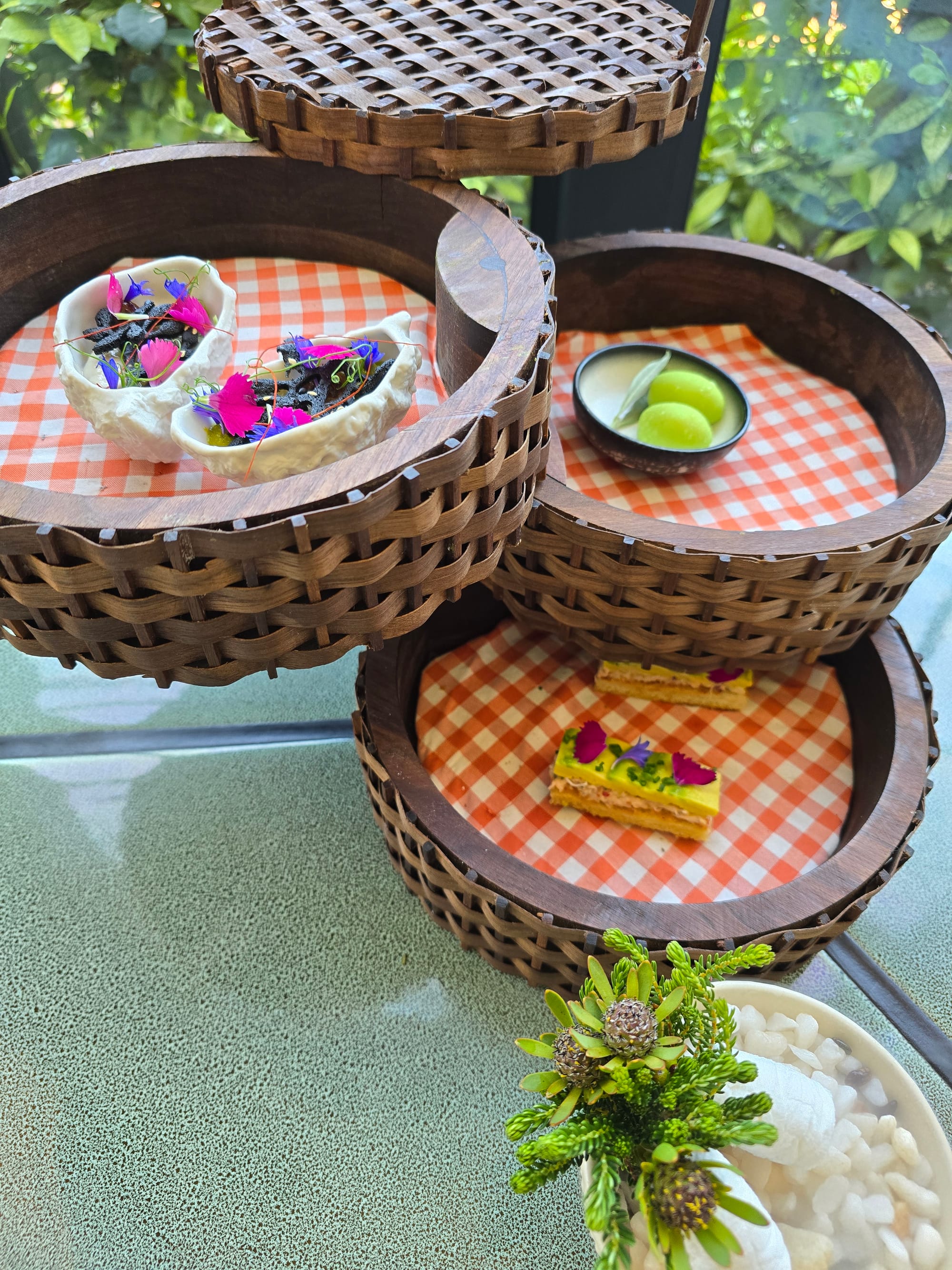 We are always welcomed in an indoors patio area where we can have a drink and the first amuse bouches of the day, that come in the most wonderful triple basket. Nothing says spring like a picnic basket, we takes me way back to life in Paris, where as soon as the sun would come out, my friends and I would head to a park with wine, cheeses, fruits and laughter.