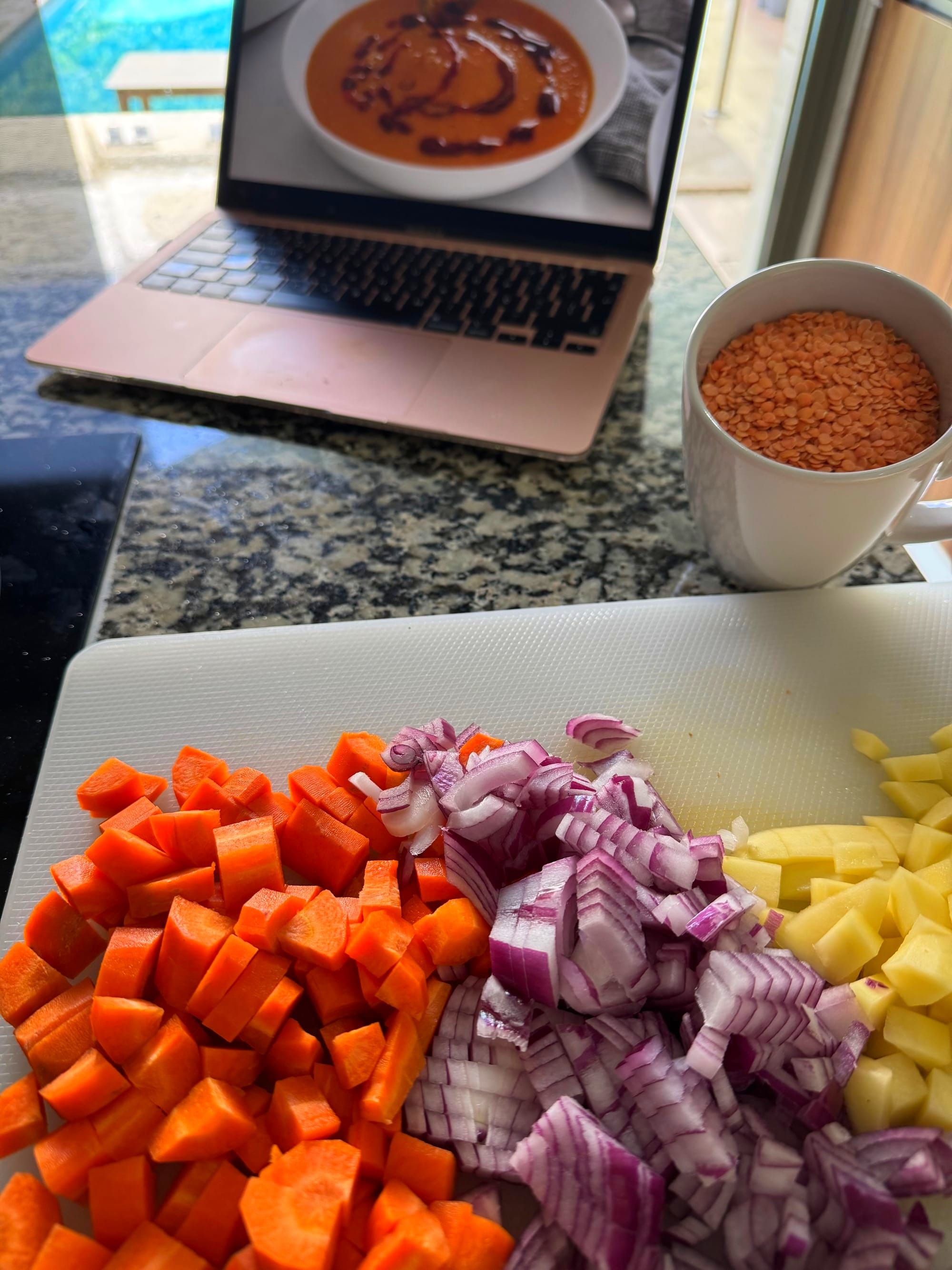 She recently launched a new Red Lentil Soup recipe. I don't eat lentils as often as I did when living in France - I love a green lentil salad with a touch of Moutarde de Dijon and a poached egg on top! - but I do love this protein rich grain. So I grabbed lentils at the store yesterday, I saw the recipe a dozen times and I got myself ready to recreate it. I had never made soup before, so I needed it to be easy. And this recipe did not disappoint.