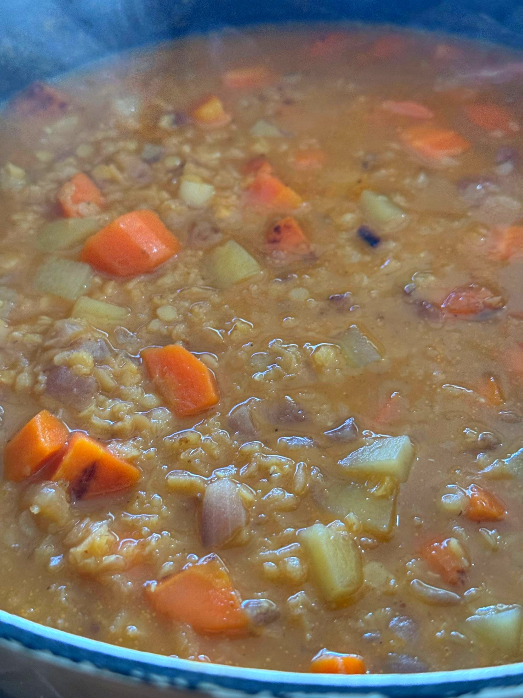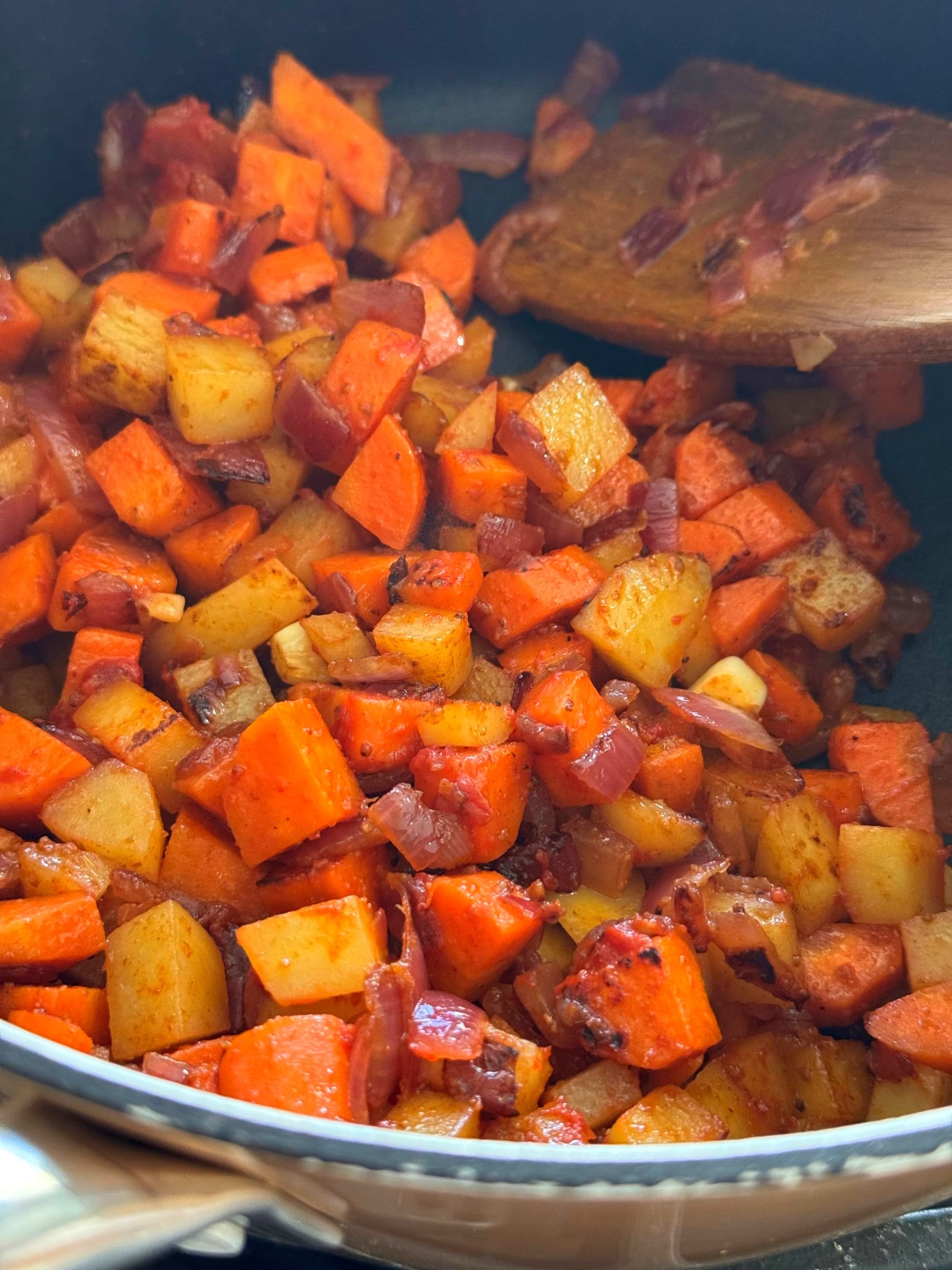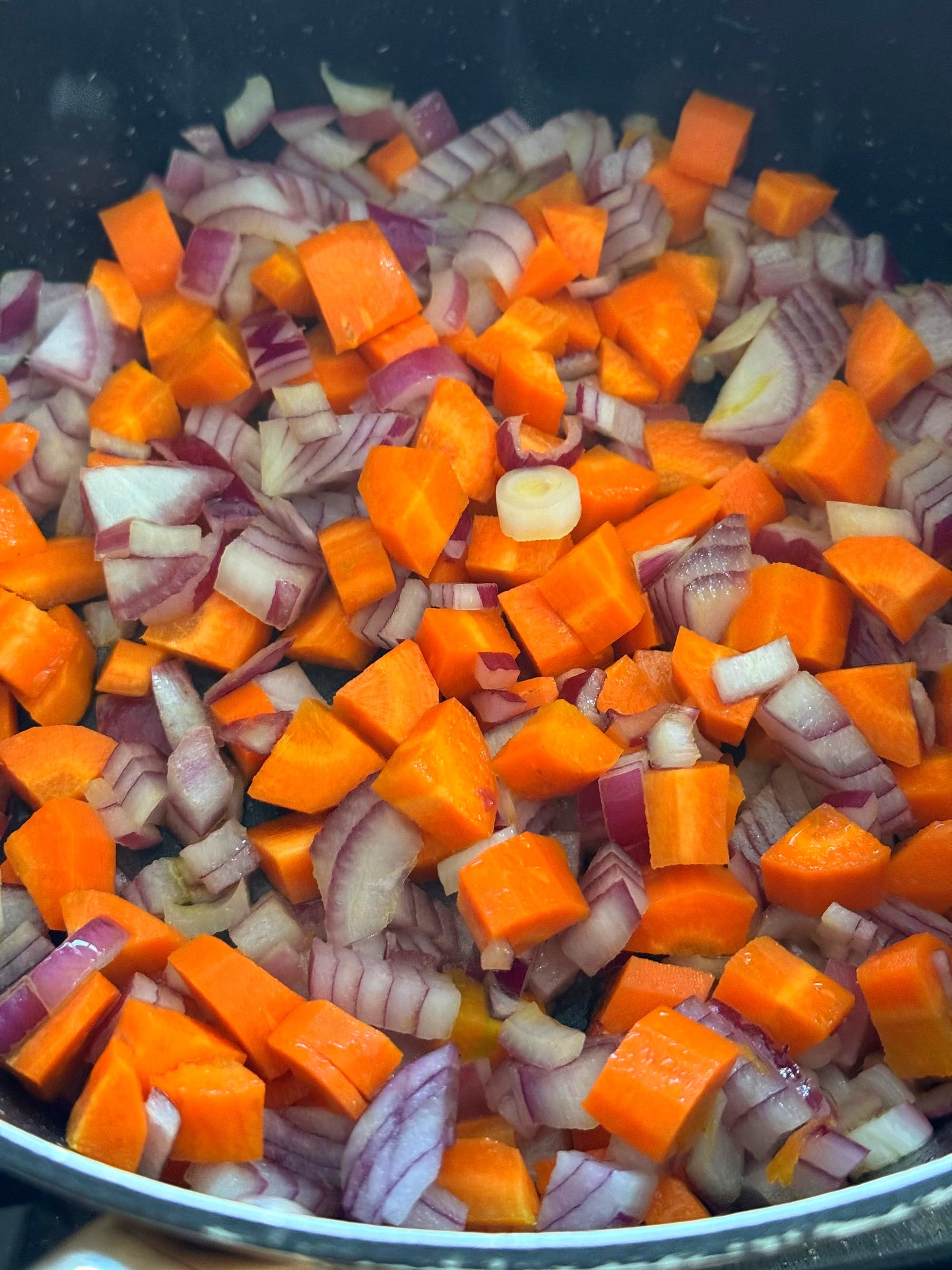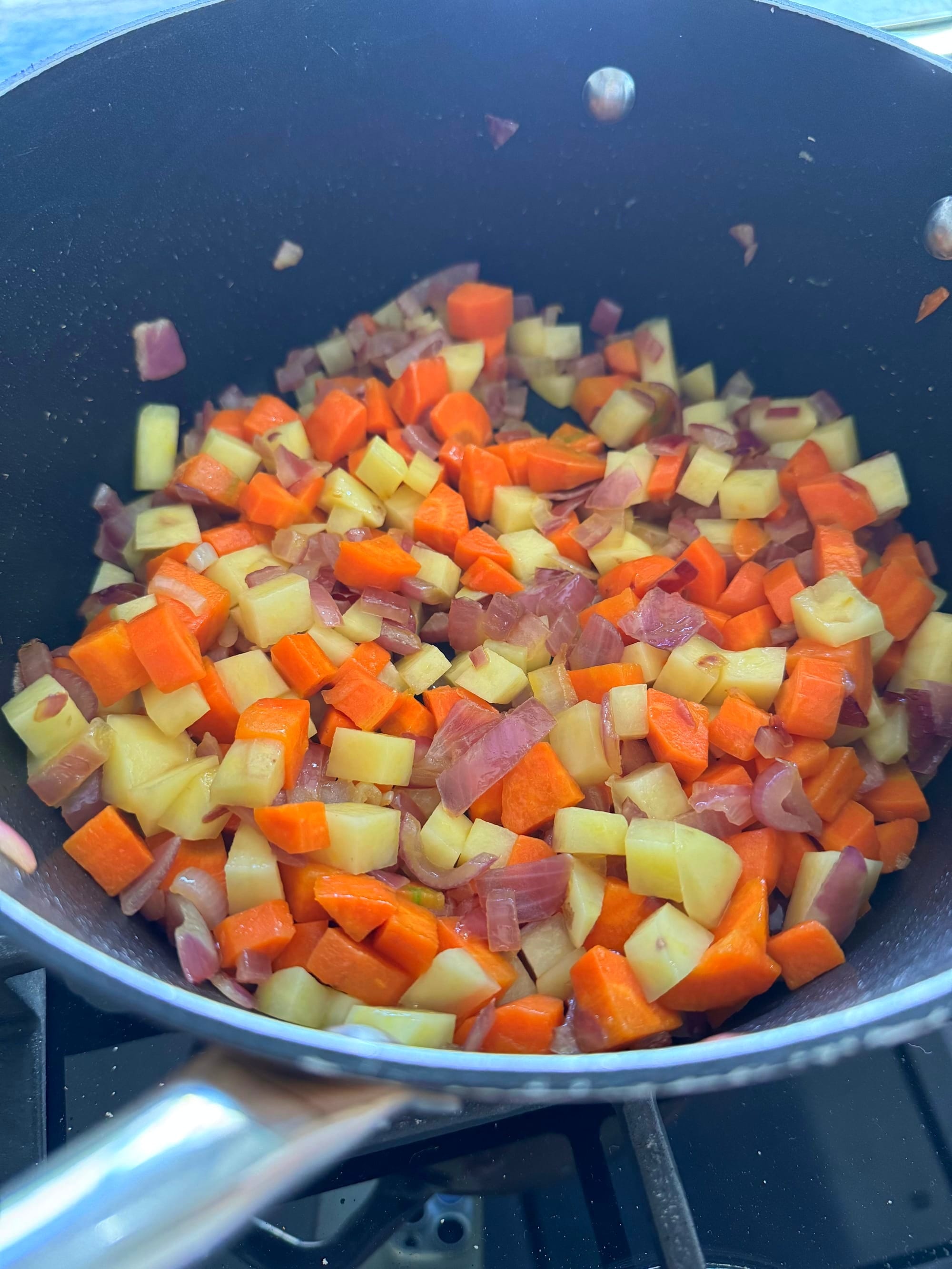 First you sweat the carrots and onion on olive oil. Five minutes later, you add the potato. Two minutes later, the spices and the tomato paste