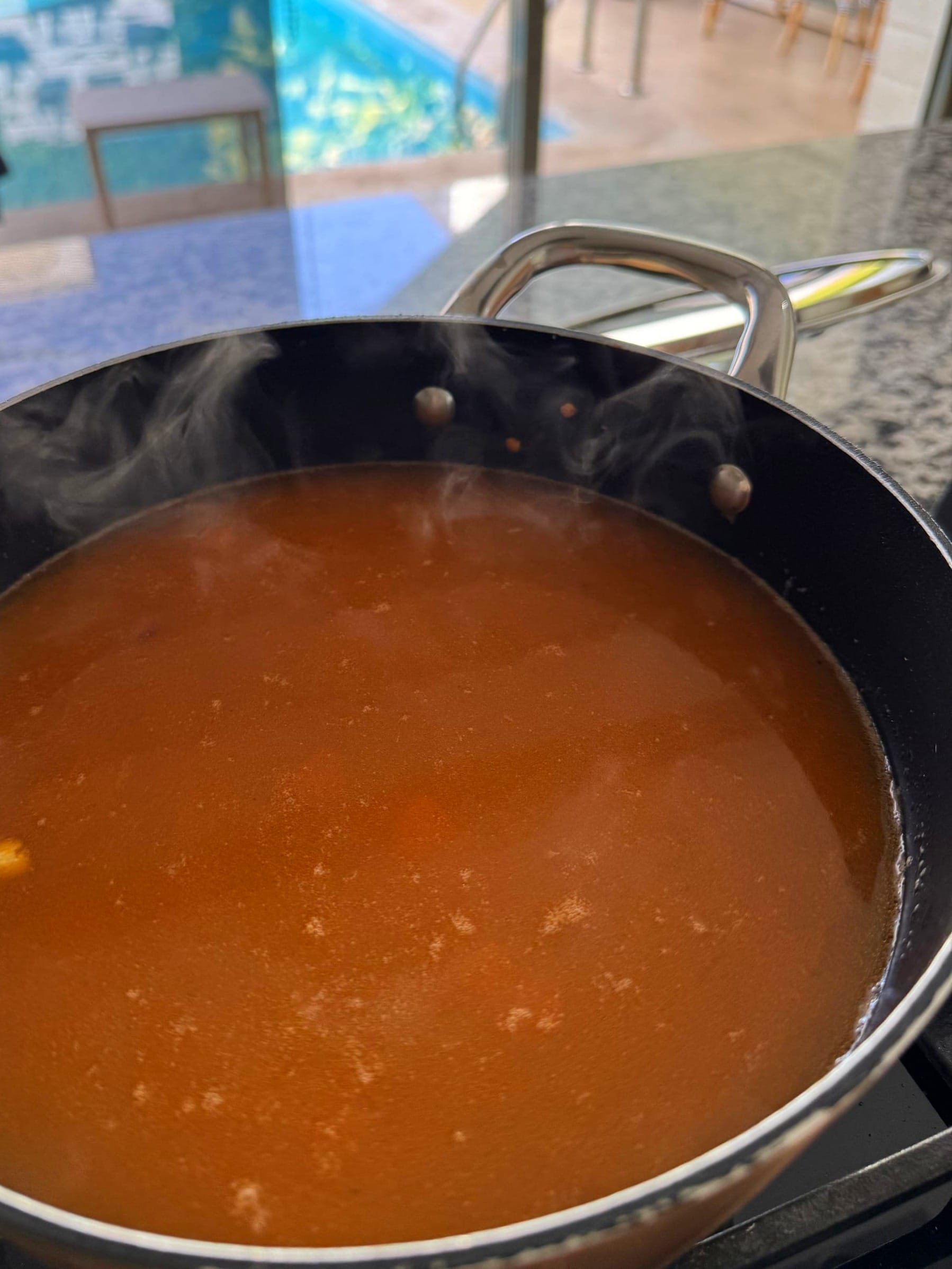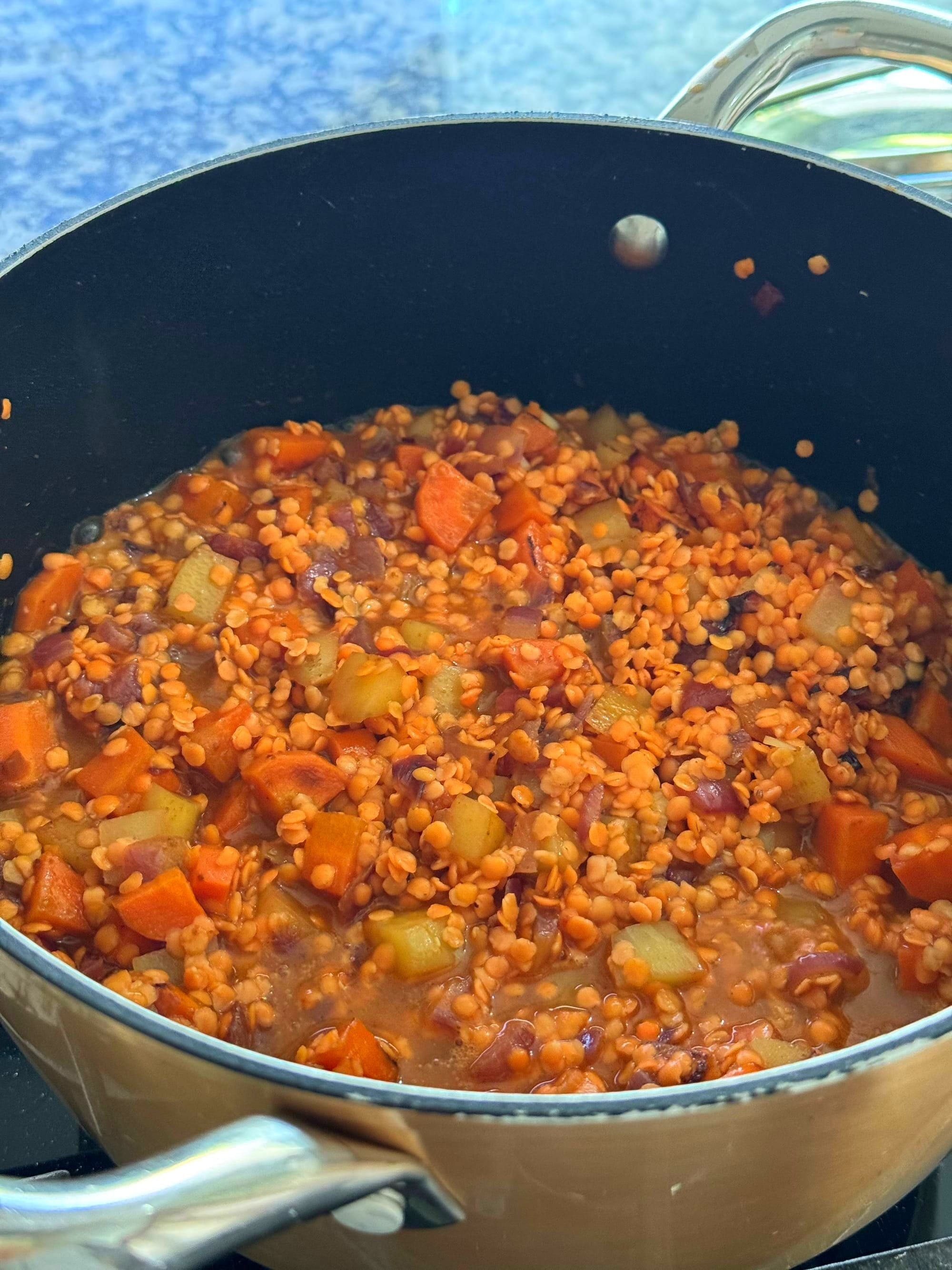I added in the rinsed lentil and 6 cups of vegetable broth with paprika (pimentão)
