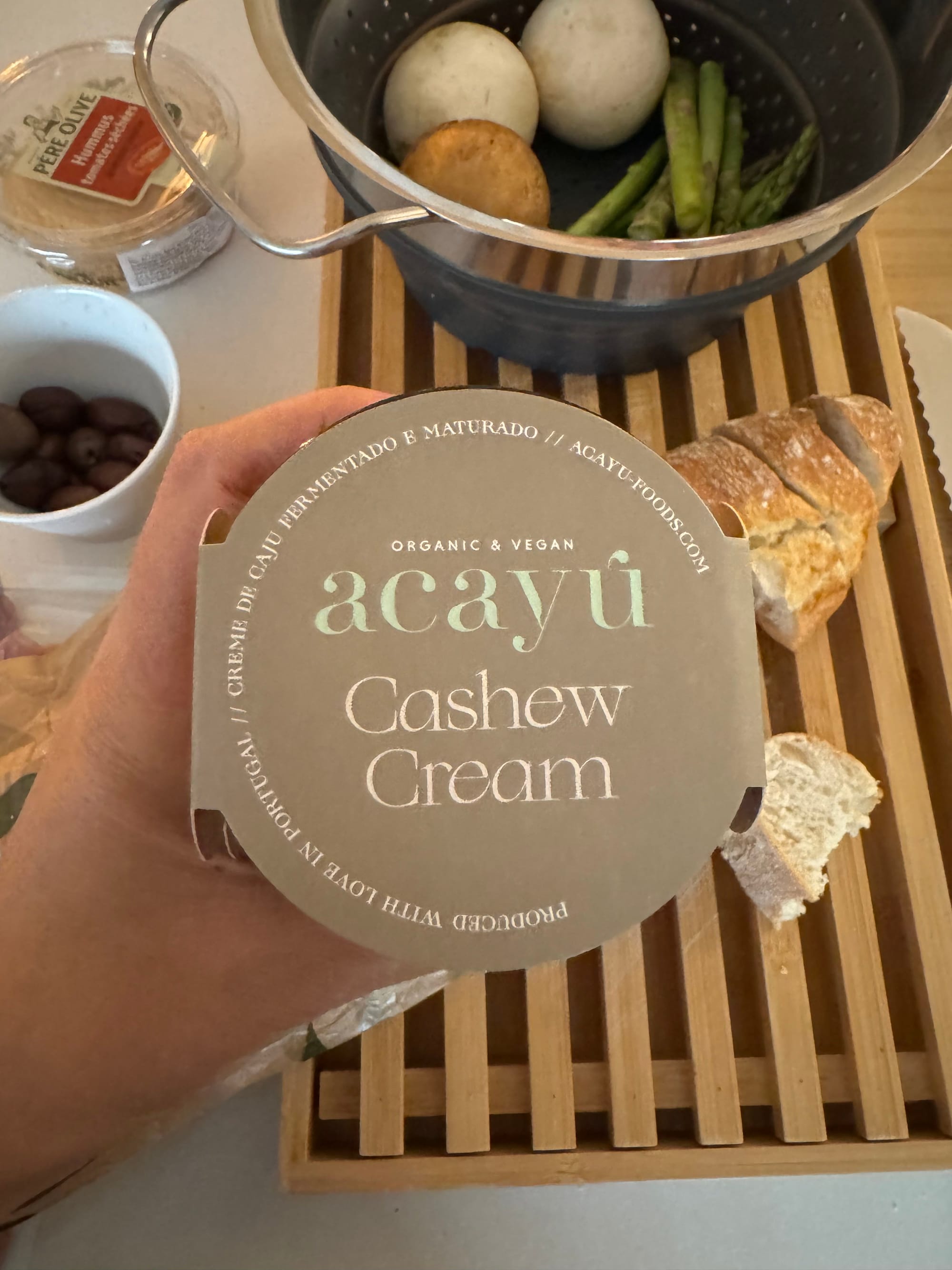 I really like the crudités platter she does in this episode, with hummus. Even if it is so so easy to do, sometimes we also buy store bought. We recently found the most incredible cashew hummus at Apolonia Supermercados, the portuguese Erewhon, from a brand called Acayu. I cannot wait to go to Algarve to grab another one, it is delicious with crudités or spread over a fresh baguette sliced. Diagonally. If you know, you know.